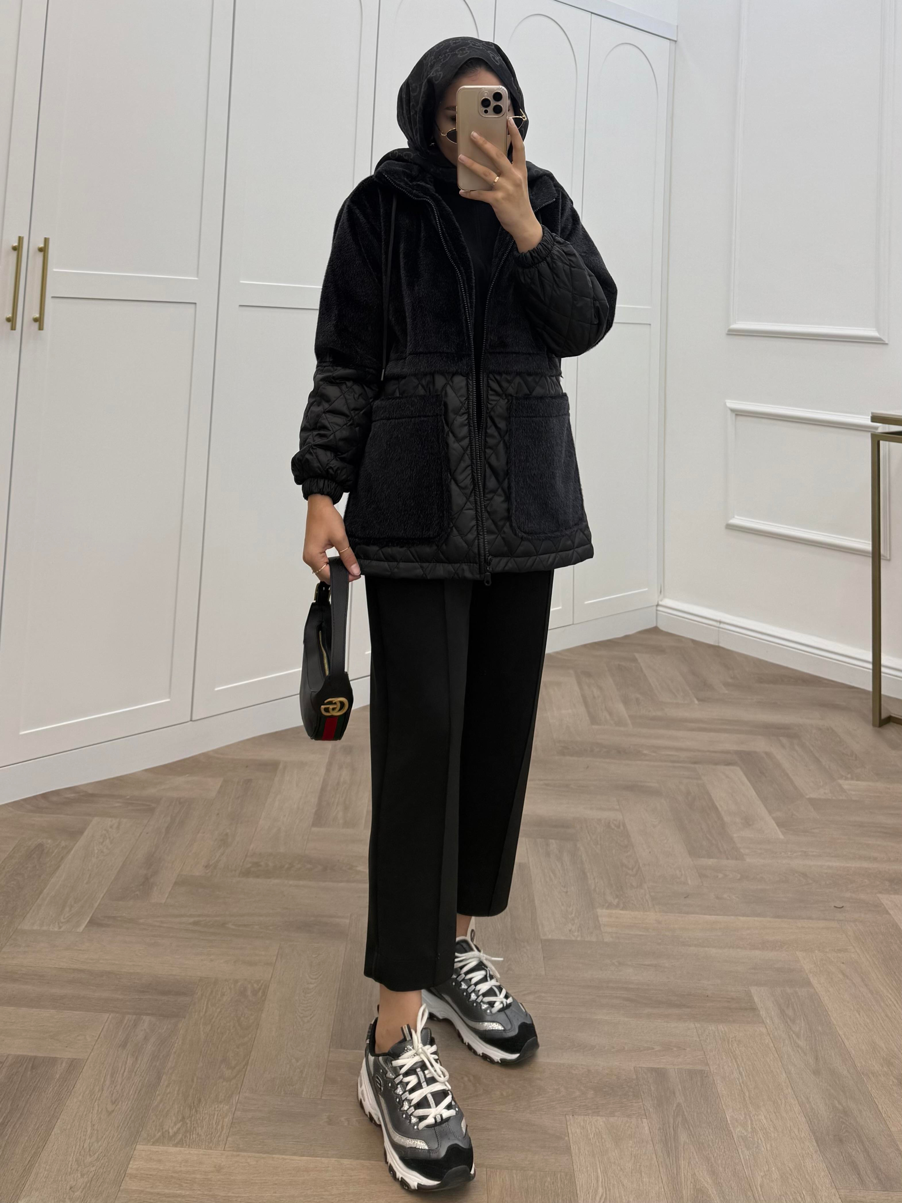 ANGORA CAPİTONE KAPÜŞONLU CEKET SİYAH
