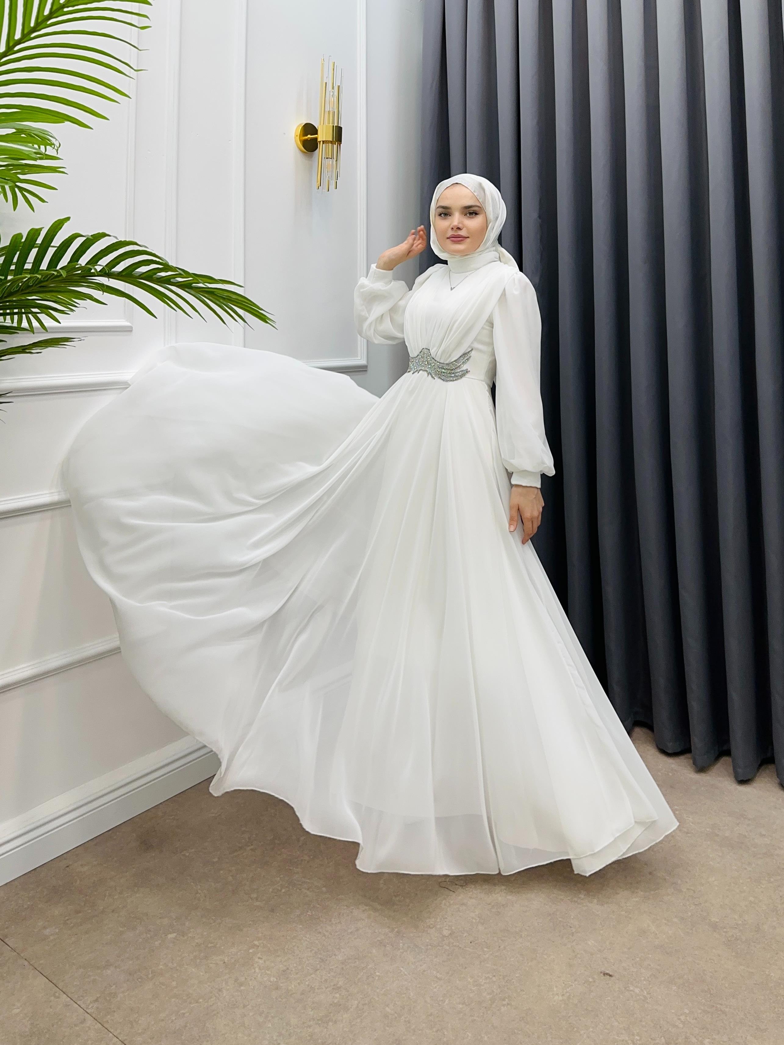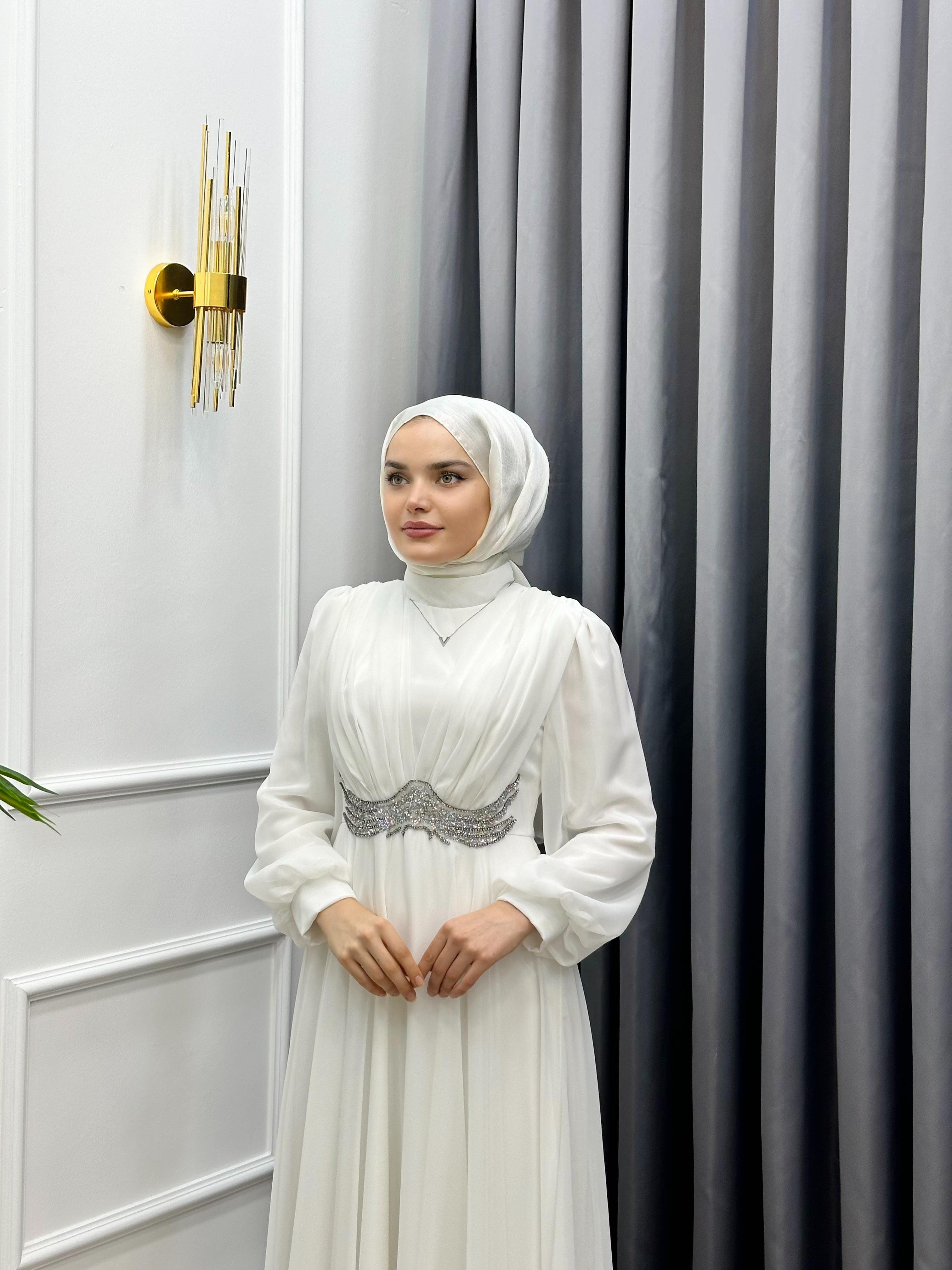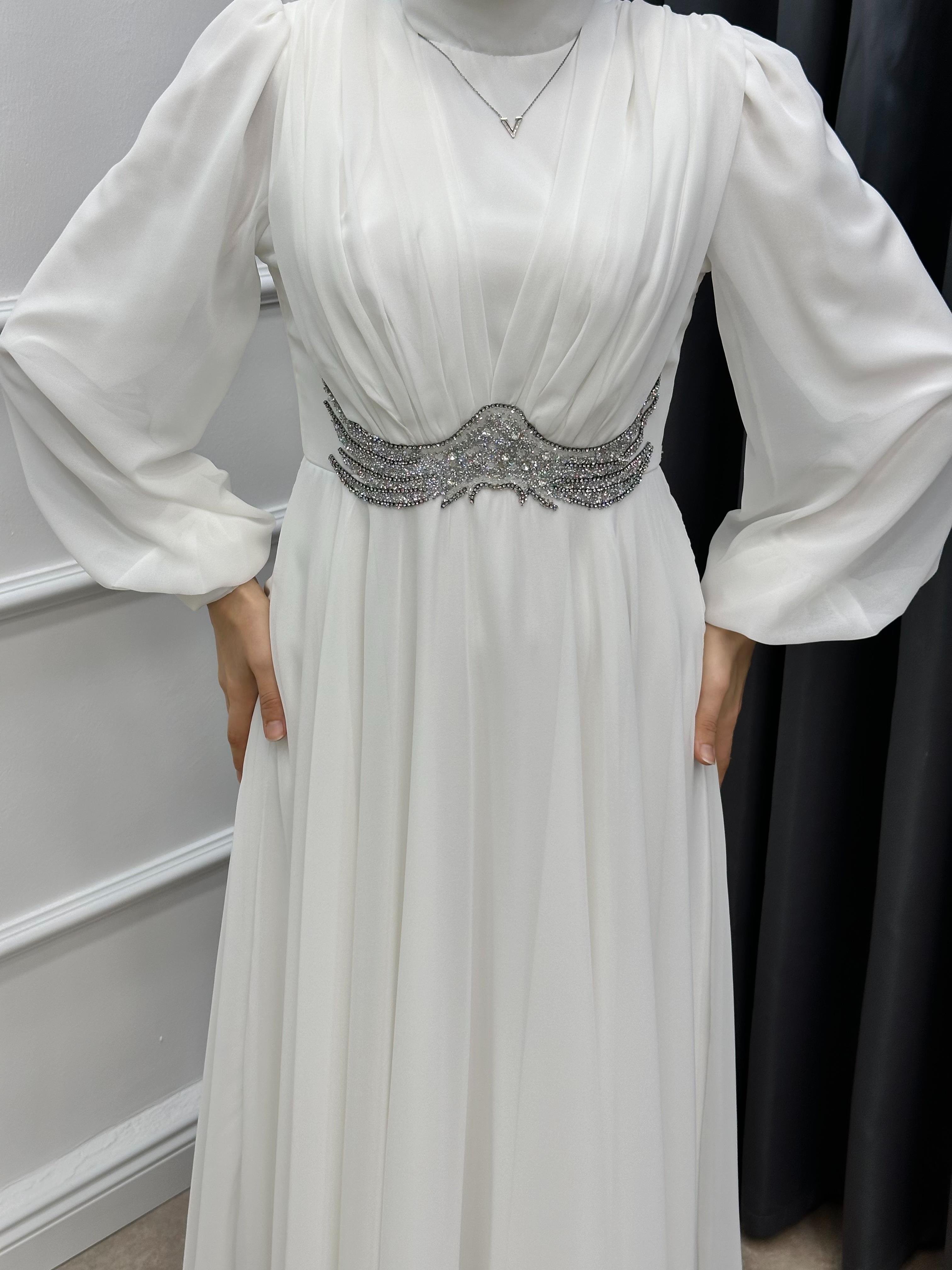 BELİ TAŞLI ŞİFON ABİYE BEYAZ
