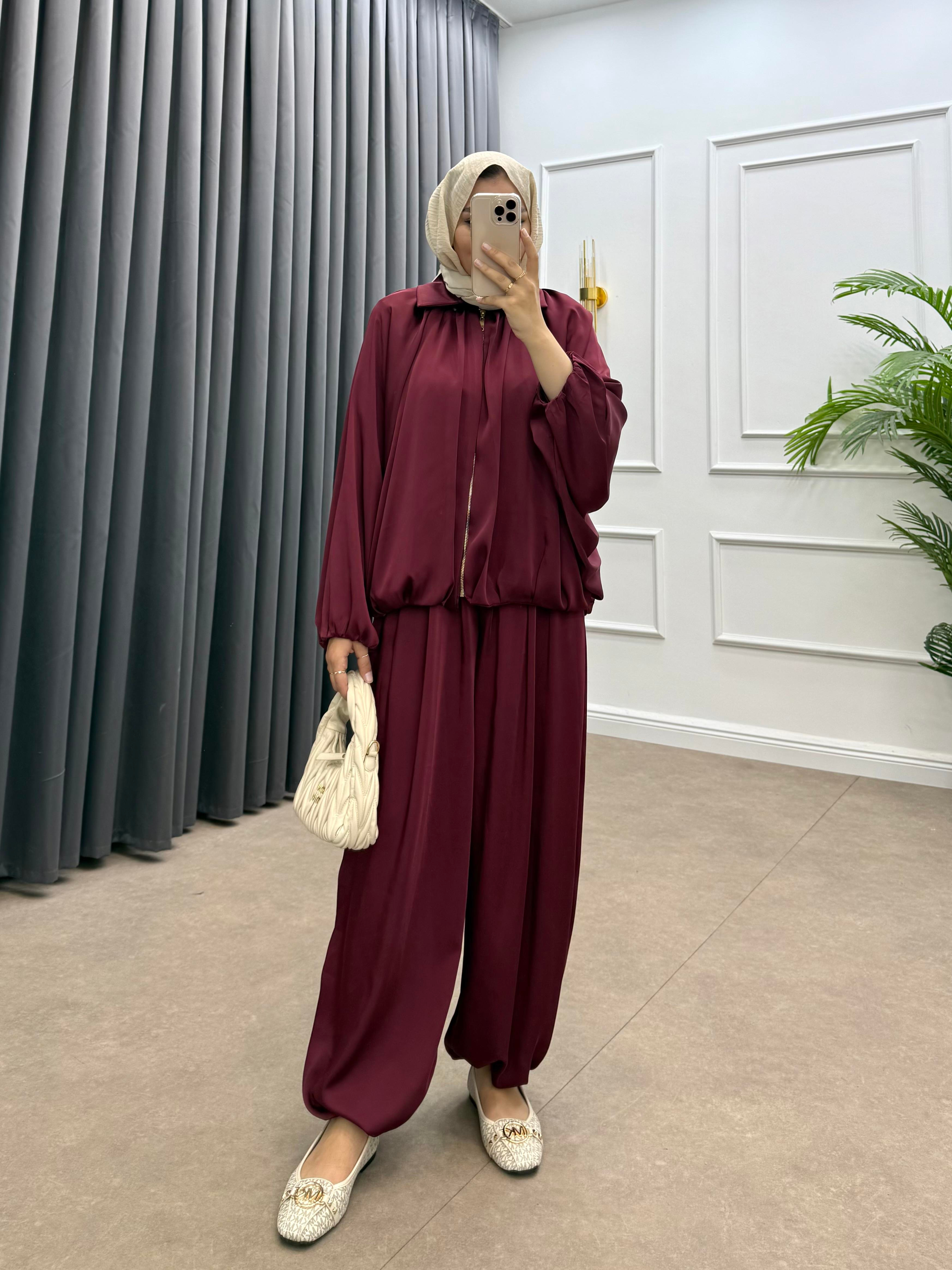 BOMBER CEKETLİ SATEN İKİLİ TAKIM BORDO