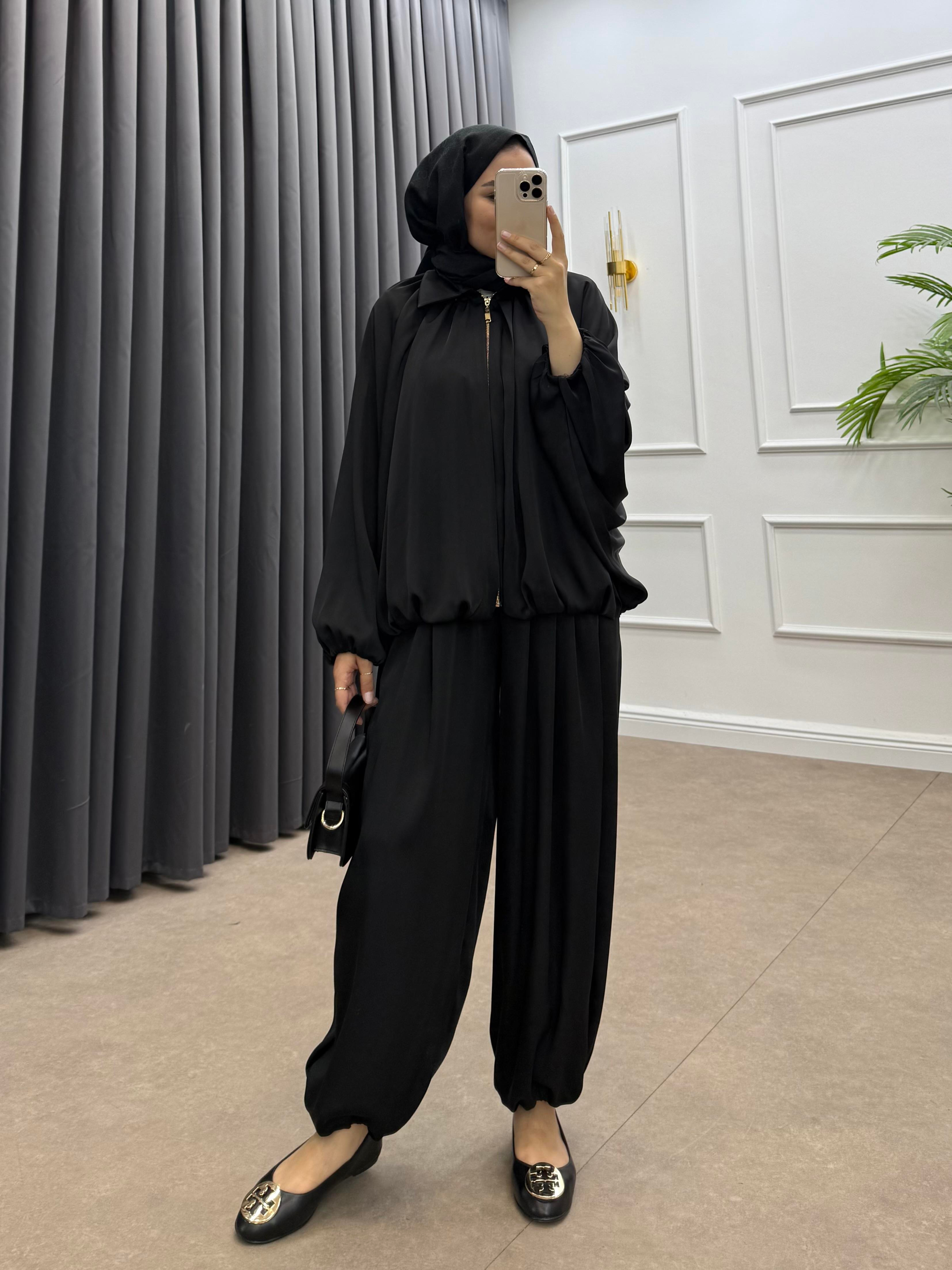 BOMBER CEKETLİ SATEN İKİLİ TAKIM SİYAH