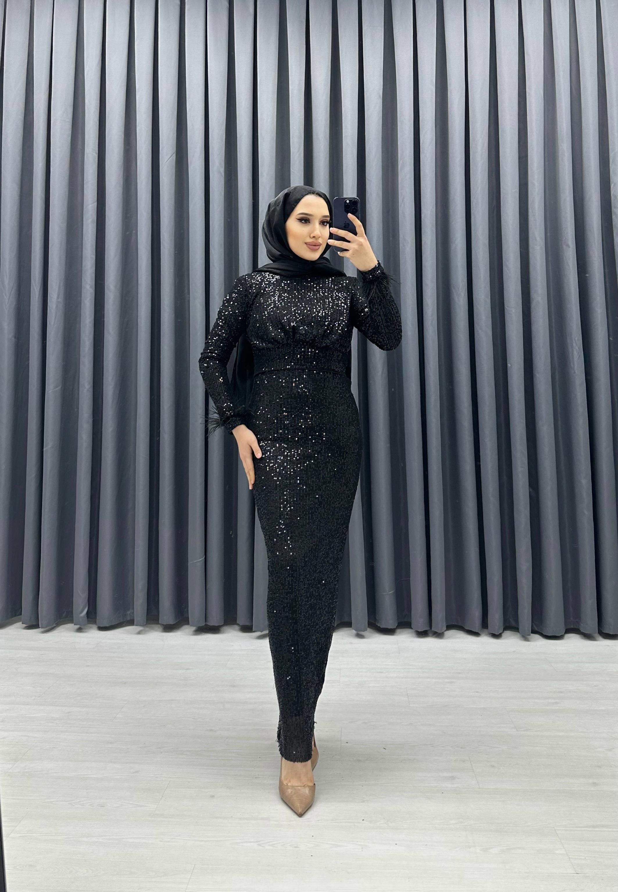BZN BEZEN PREMİUM PUL PAYET ABİYE ELBİSE SİYAH