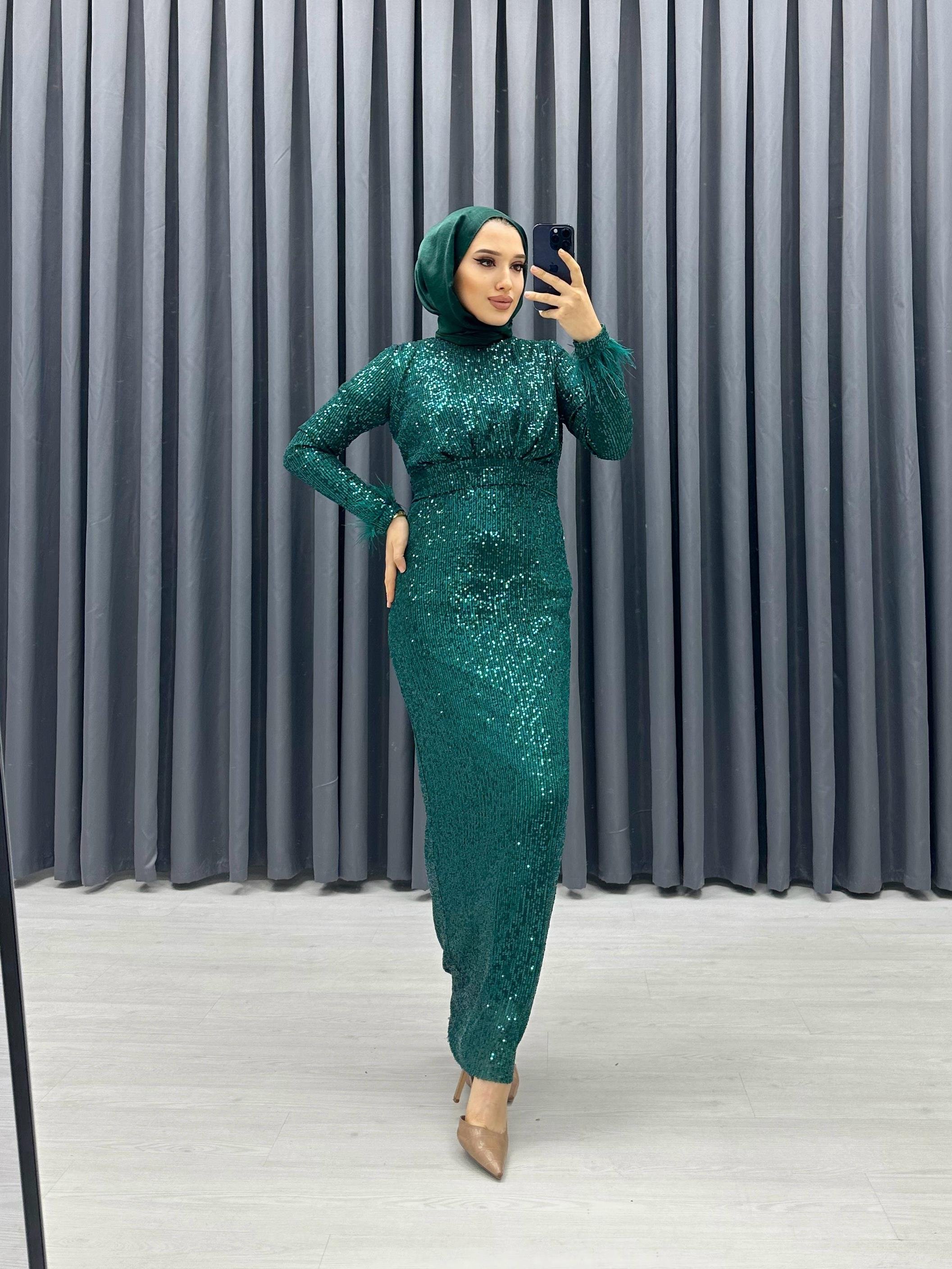 BZN BEZEN PREMİUM PUL PAYET ABİYE ELBİSE ZÜMRÜT