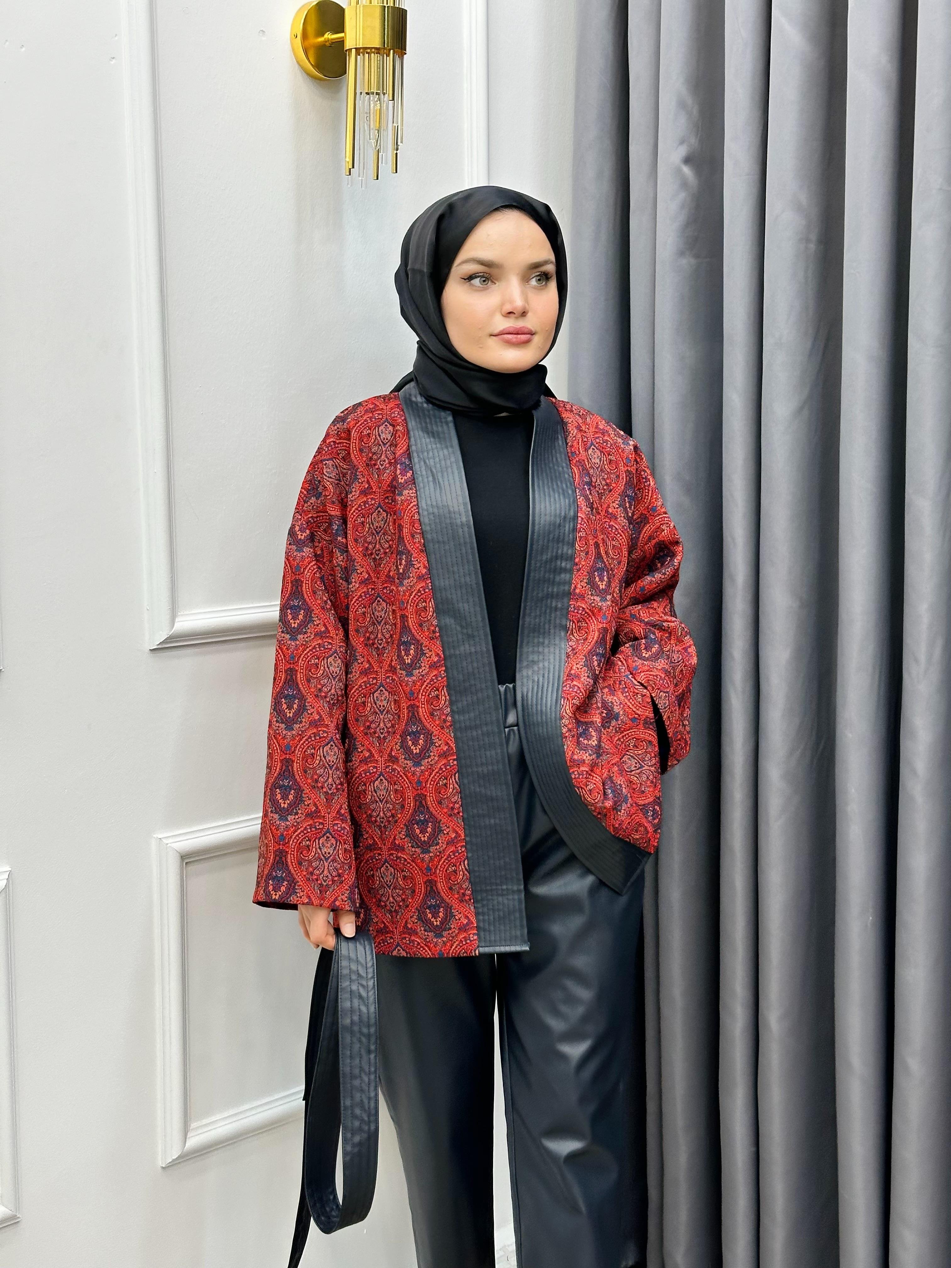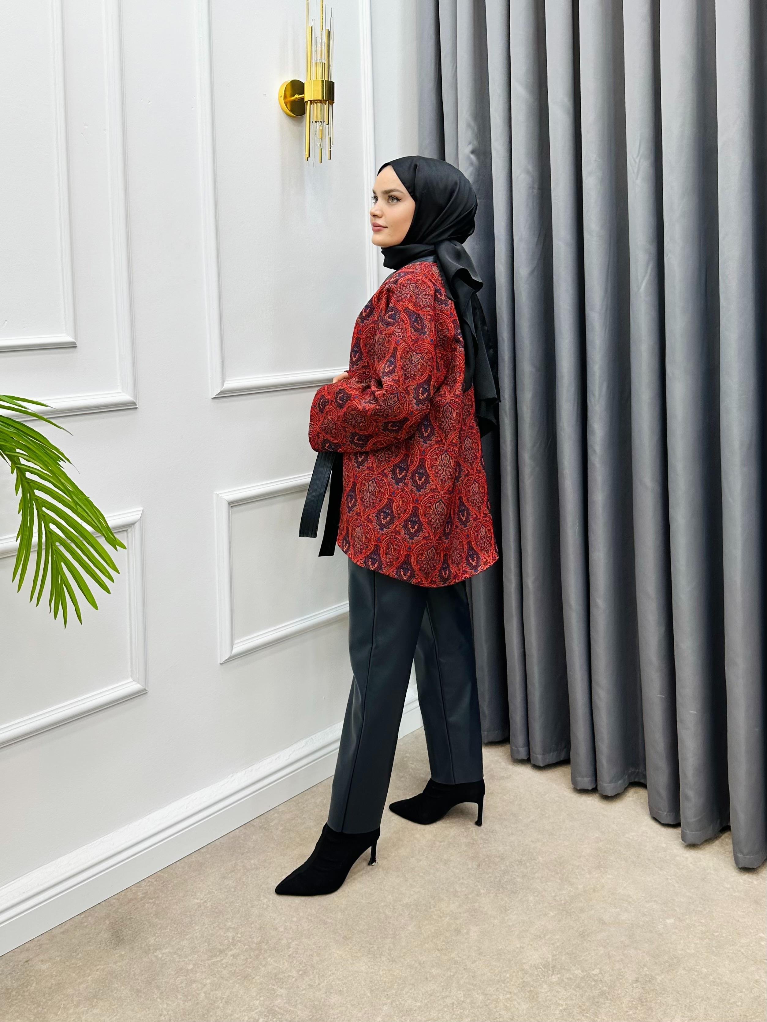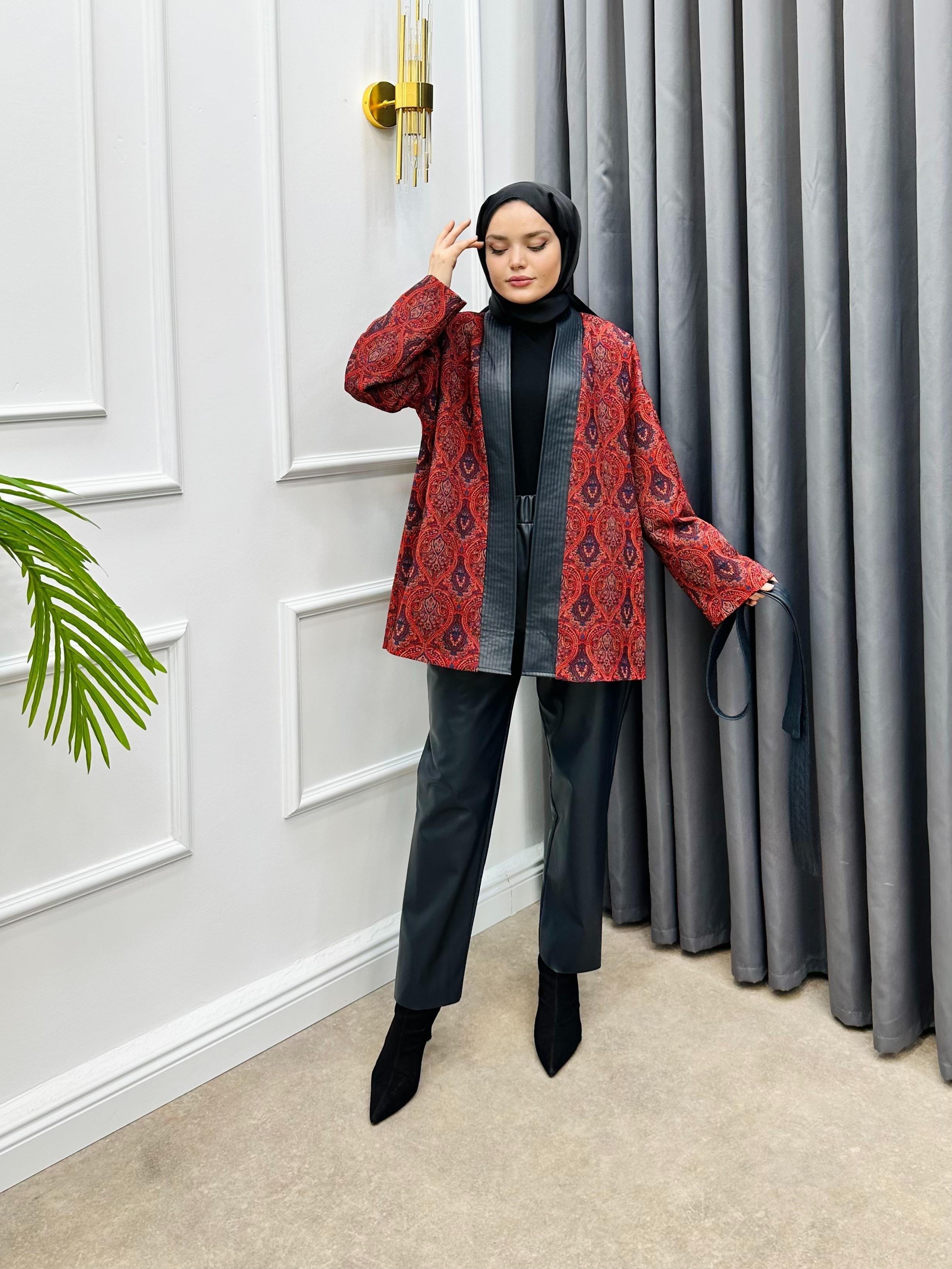 DESENLİ DERİ PANTOLONLU TAKIM KIRMIZI