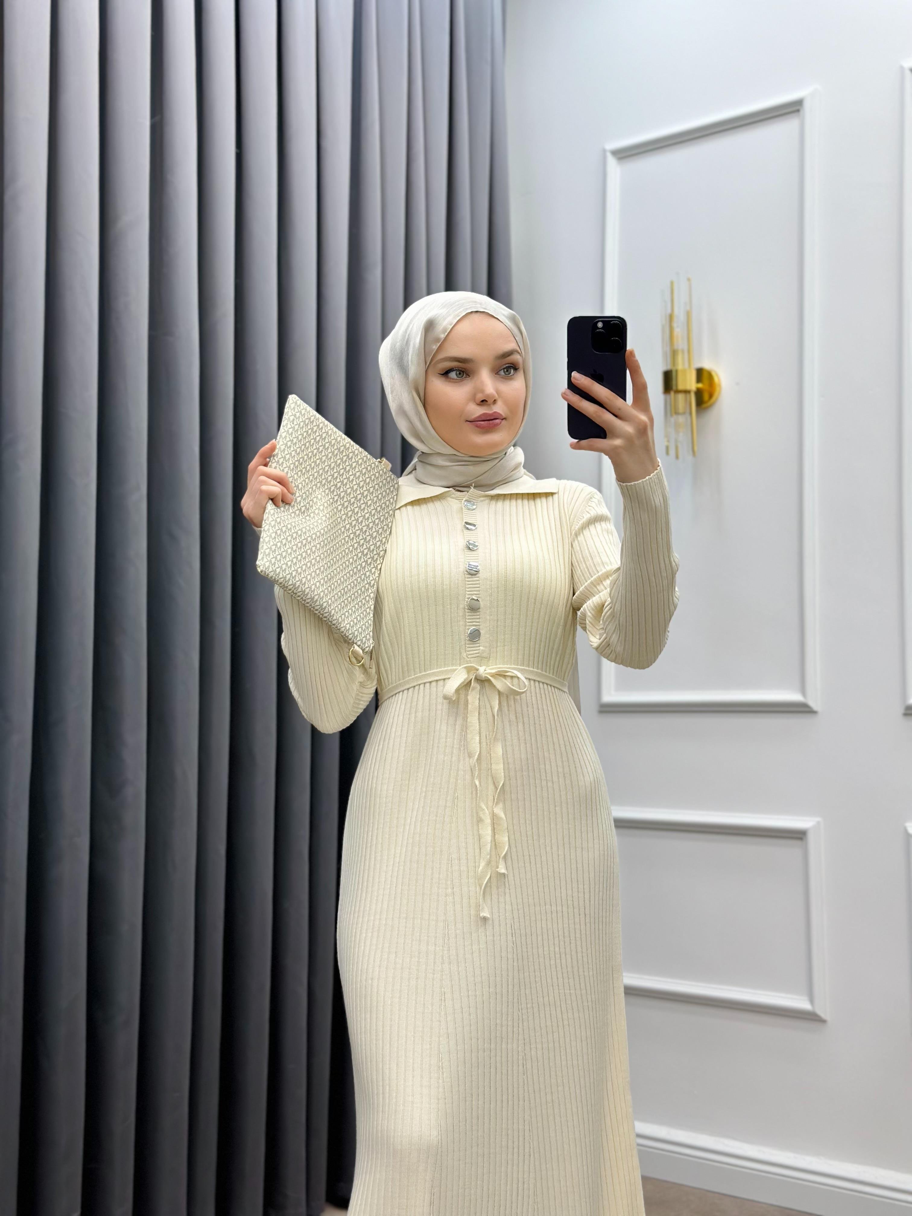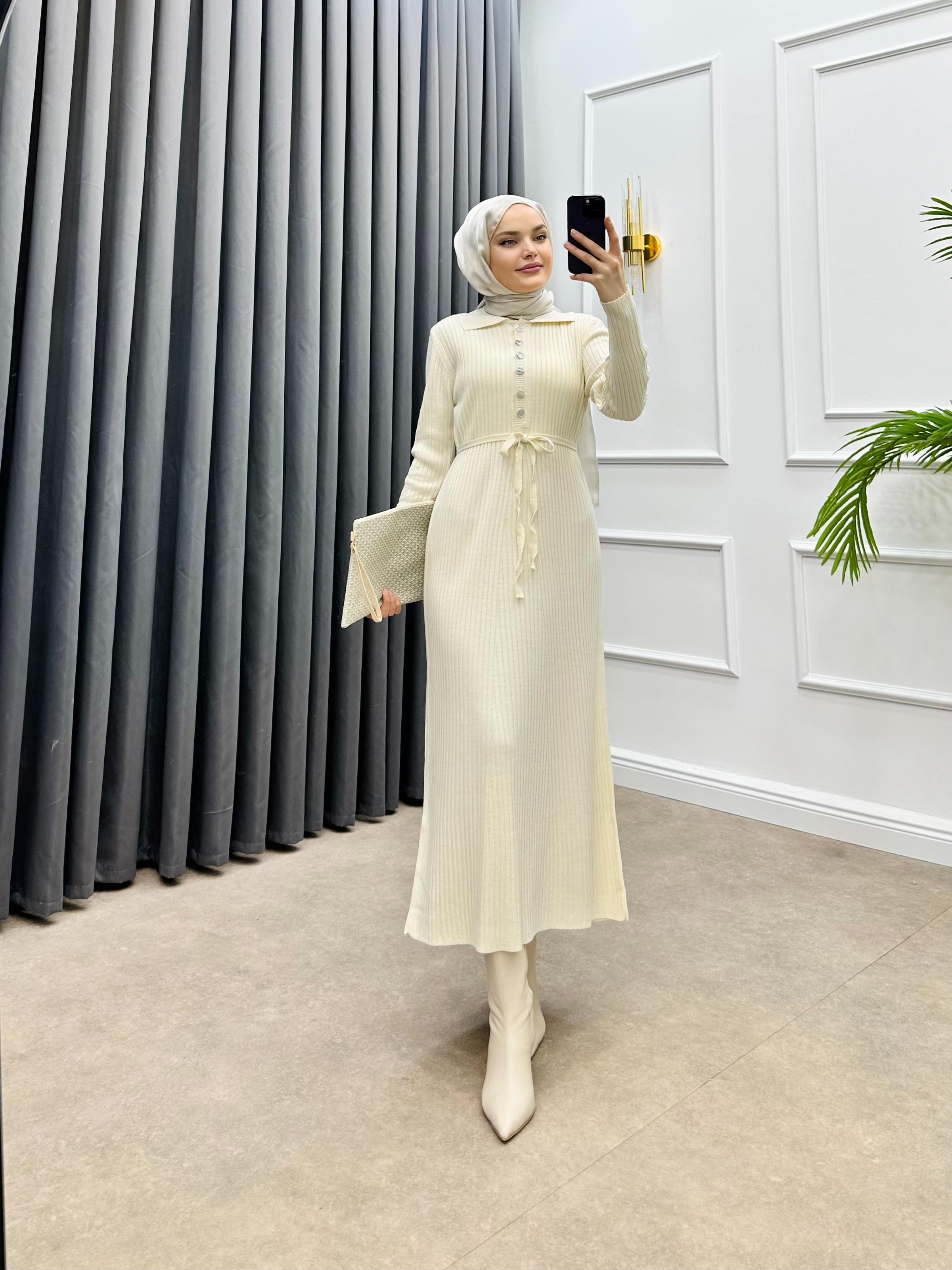 DÜĞME DETAY TRİKO ELBİSE EKRU