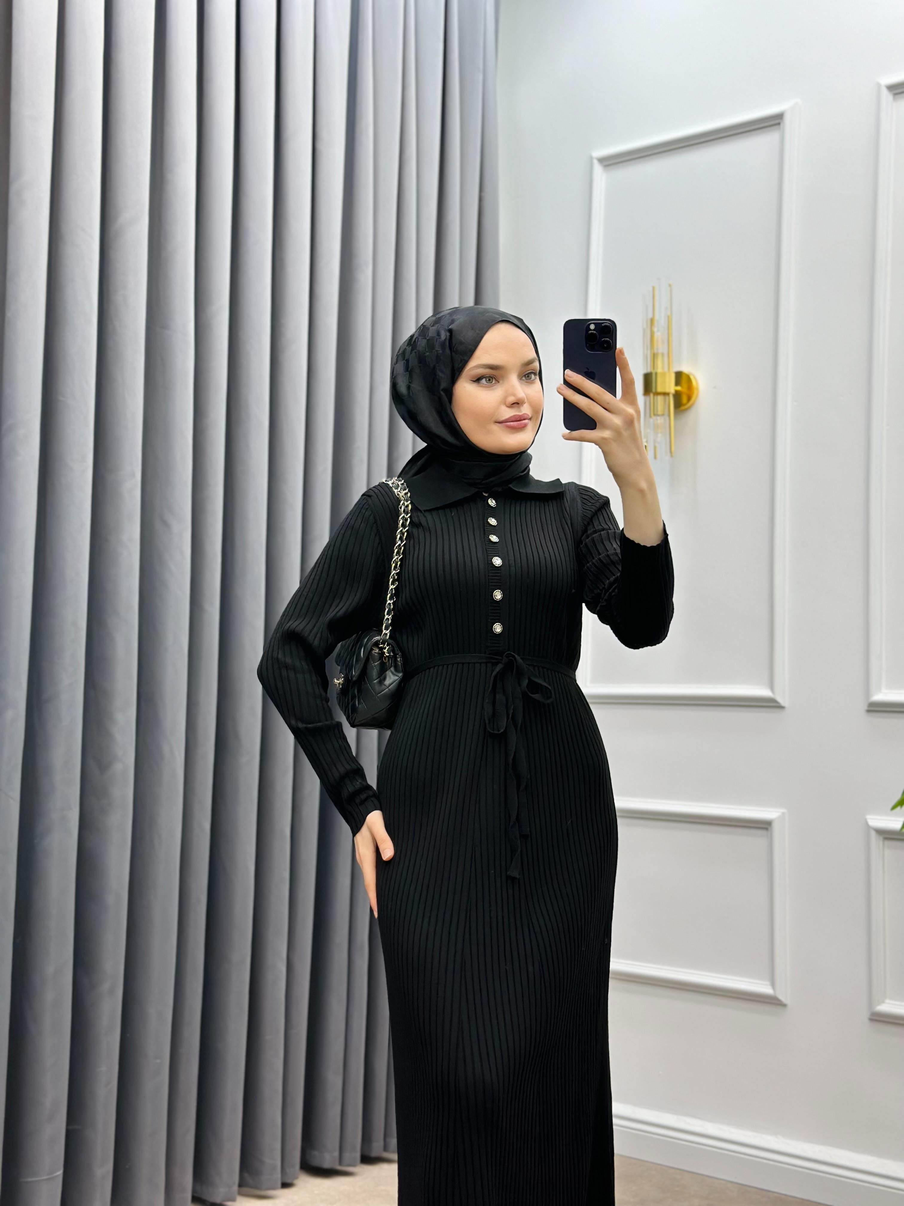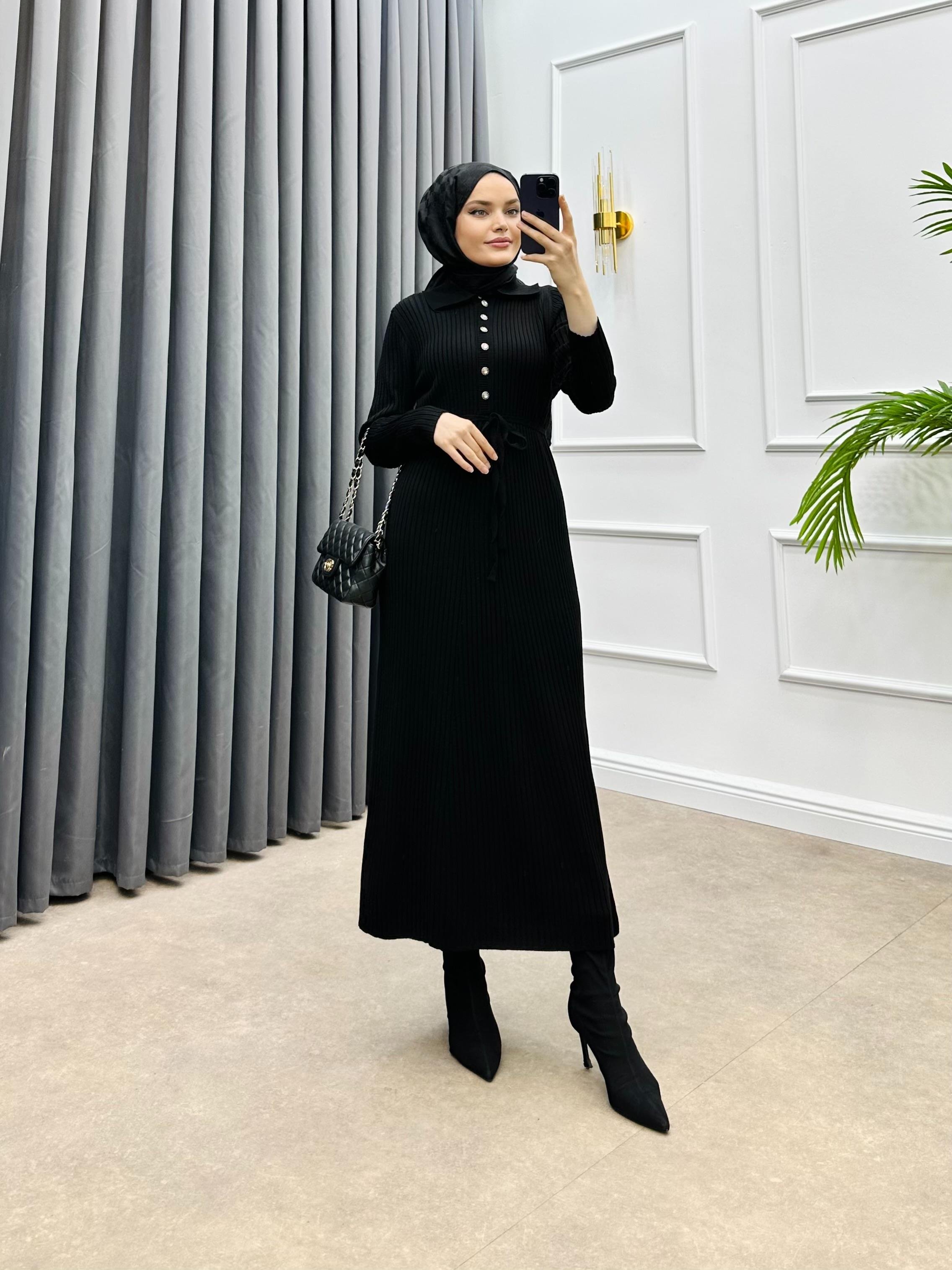 DÜĞME DETAY TRİKO ELBİSE SİYAH