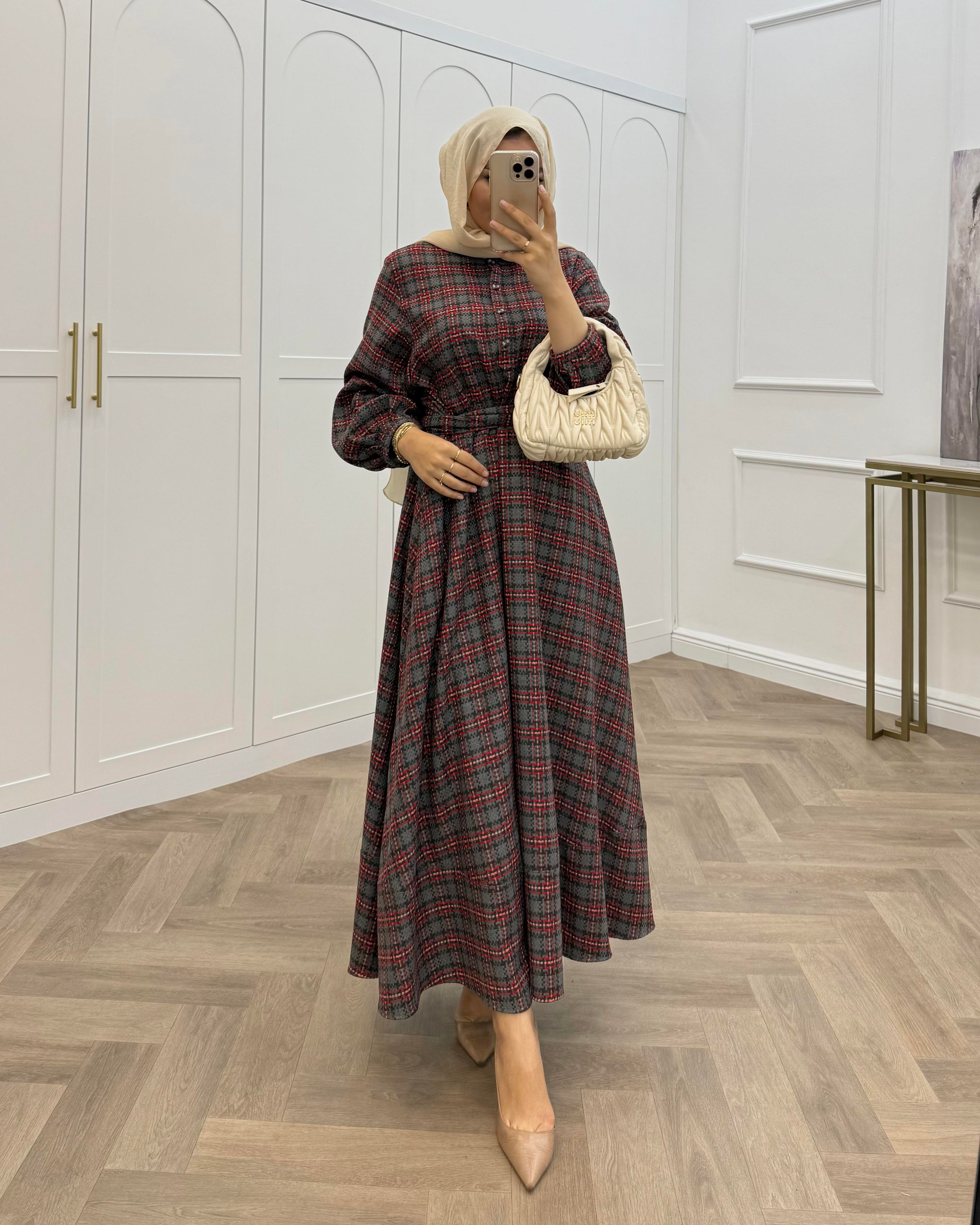 EKOSE DESENLİ BELDEN BAĞLAMALI ELBİSE KIRMIZI