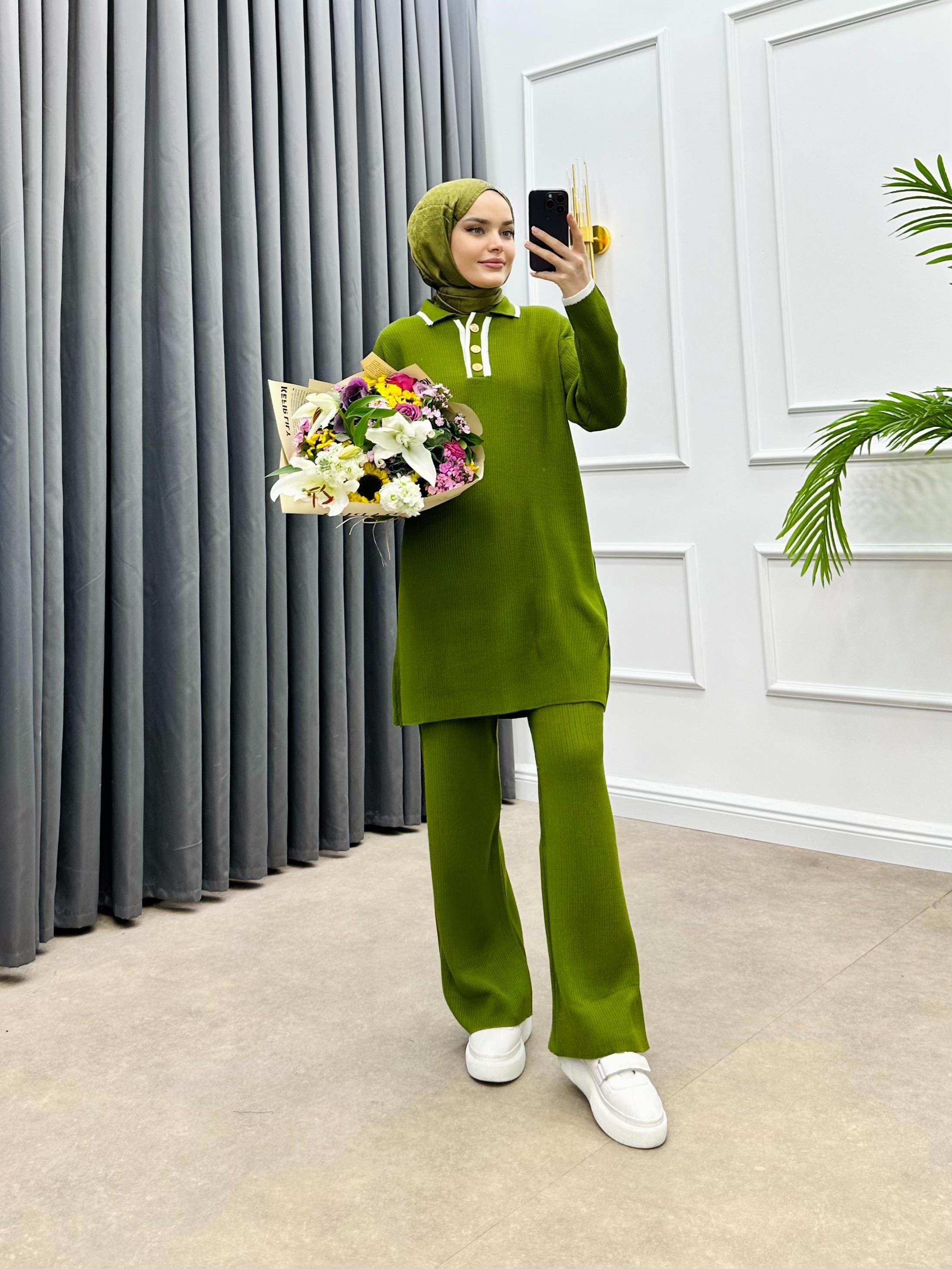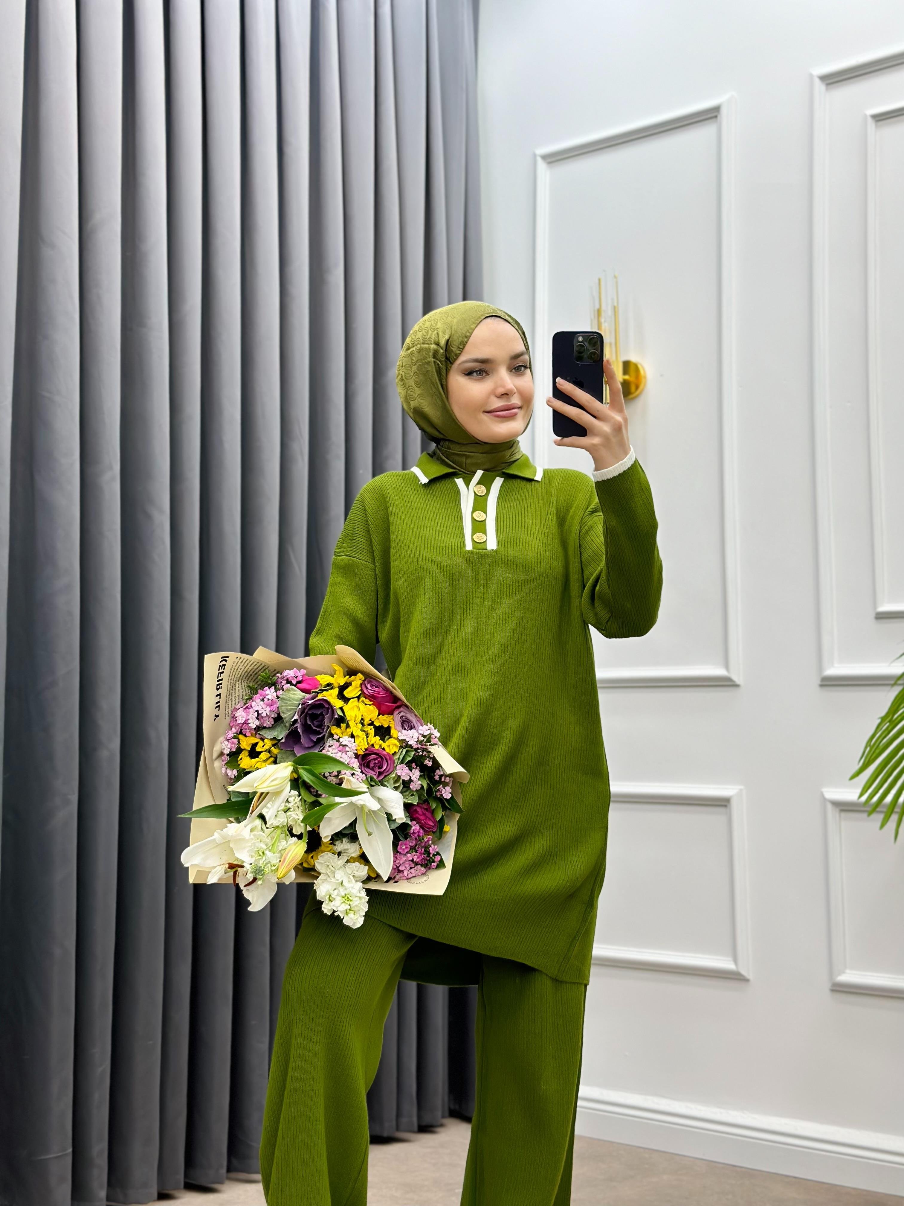 GOLD DÜĞME DETAYLI TRİKO TAKIM YAĞ YEŞİLİ