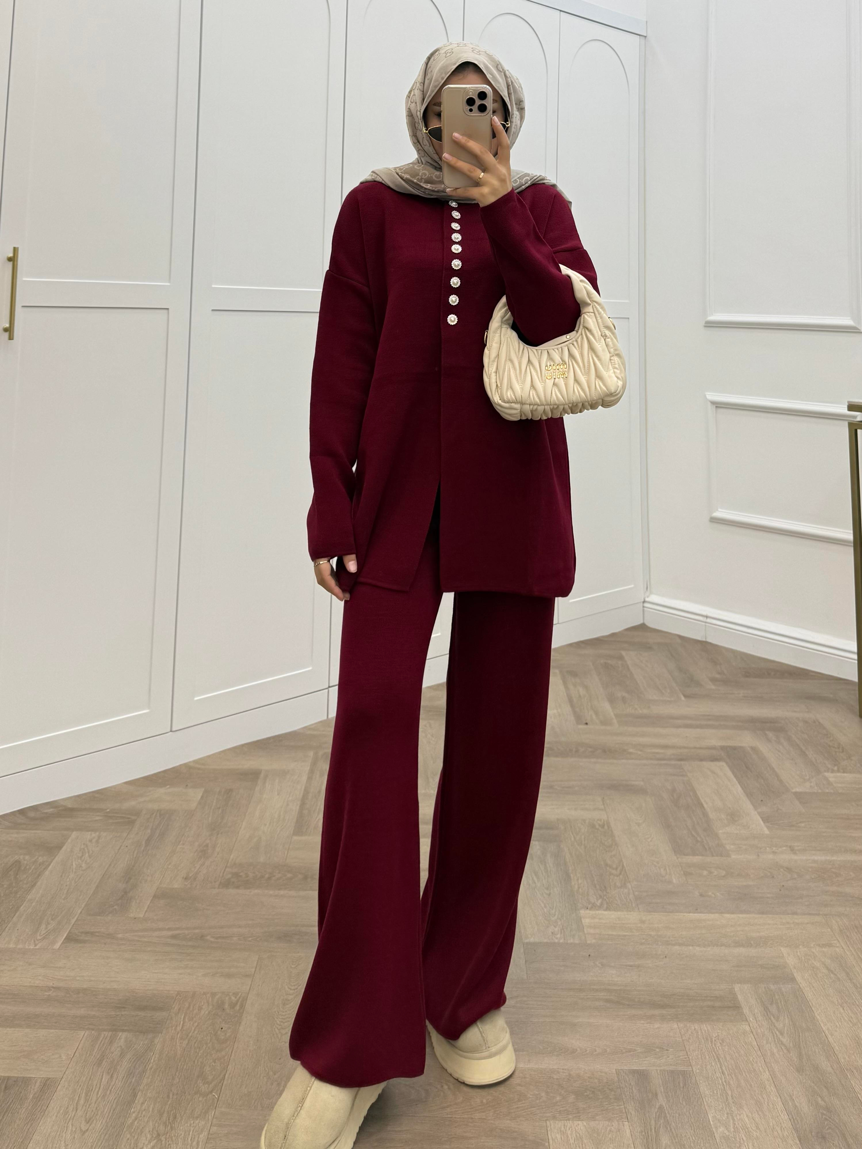 İNCİ DÜĞMELİ TRİKO TAKIM BORDO