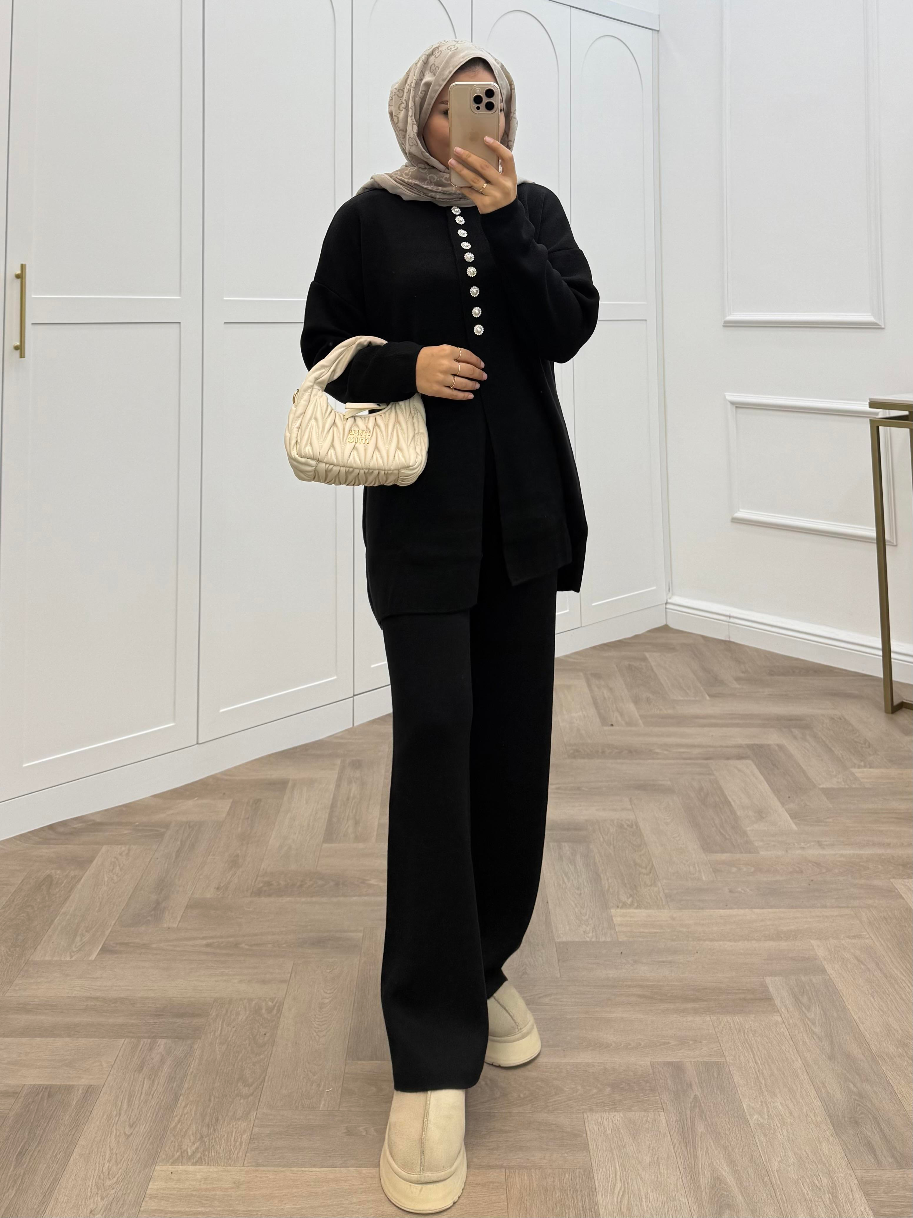 İNCİ DÜĞMELİ TRİKO TAKIM SİYAH