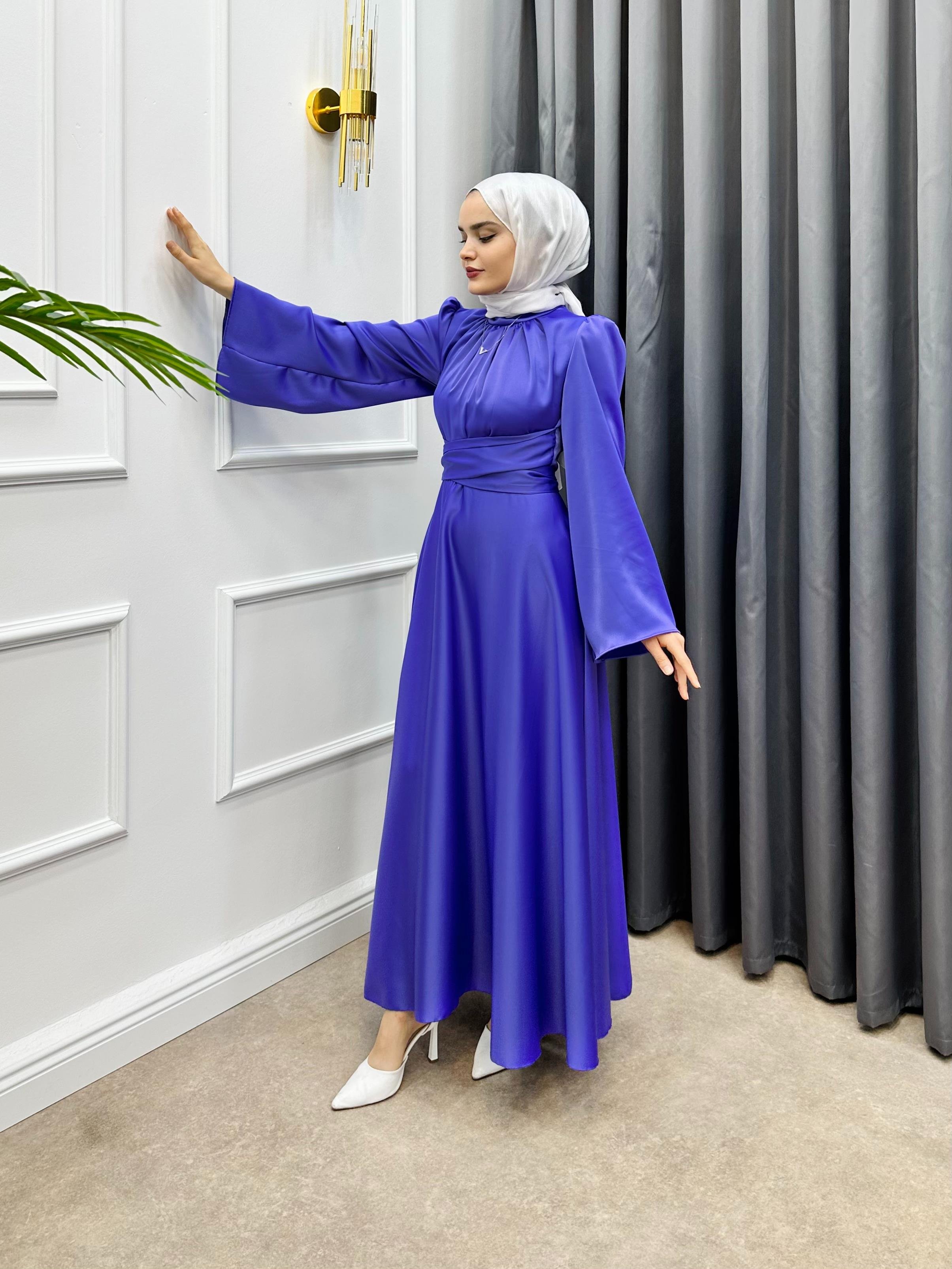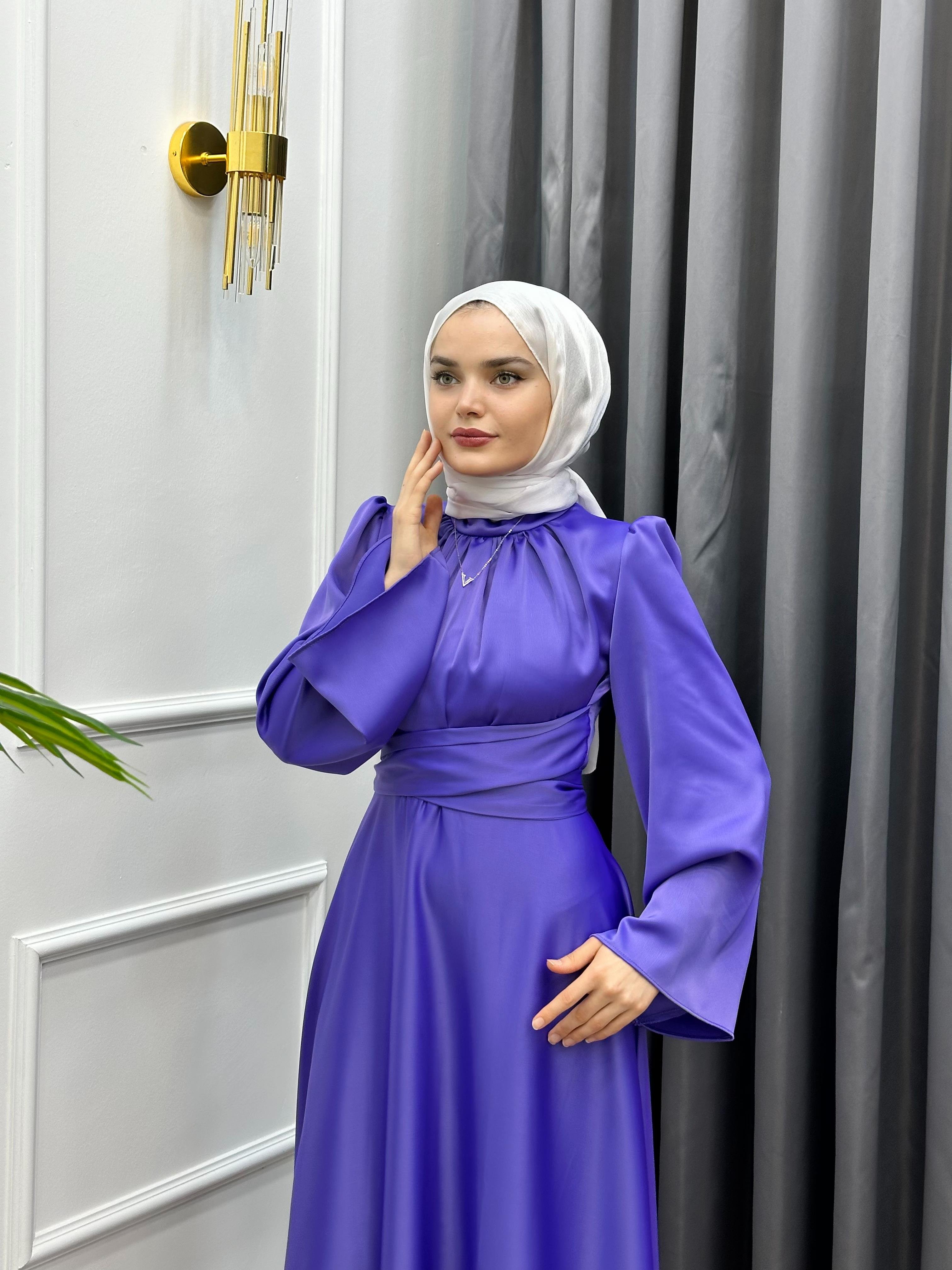 İSPANYOL KOL SATEN ELBİSE MOR