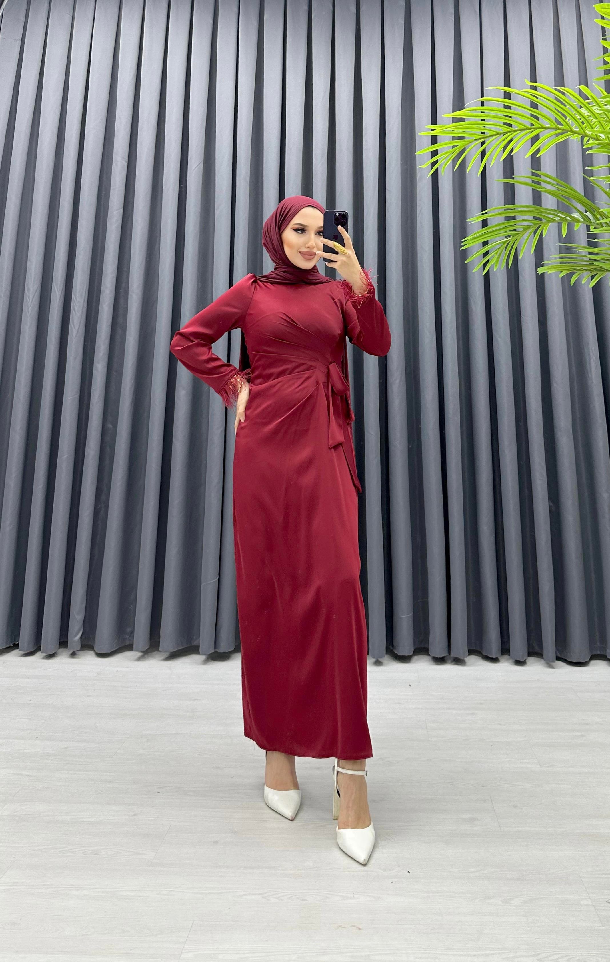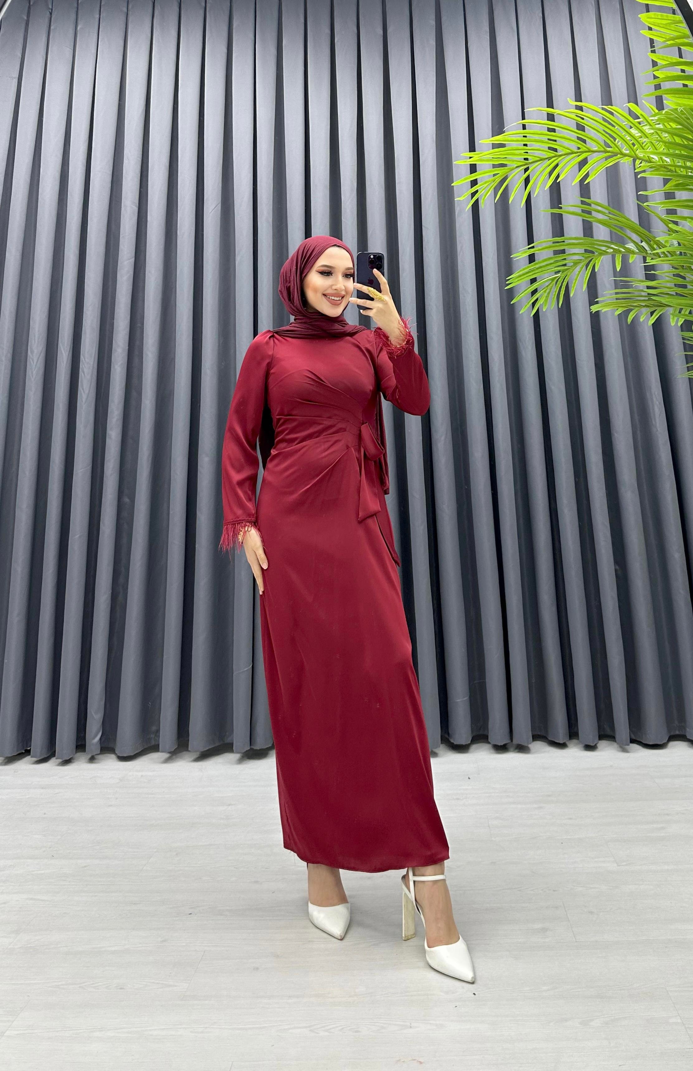 Kolları Tüylü Saten Elbise BORDO