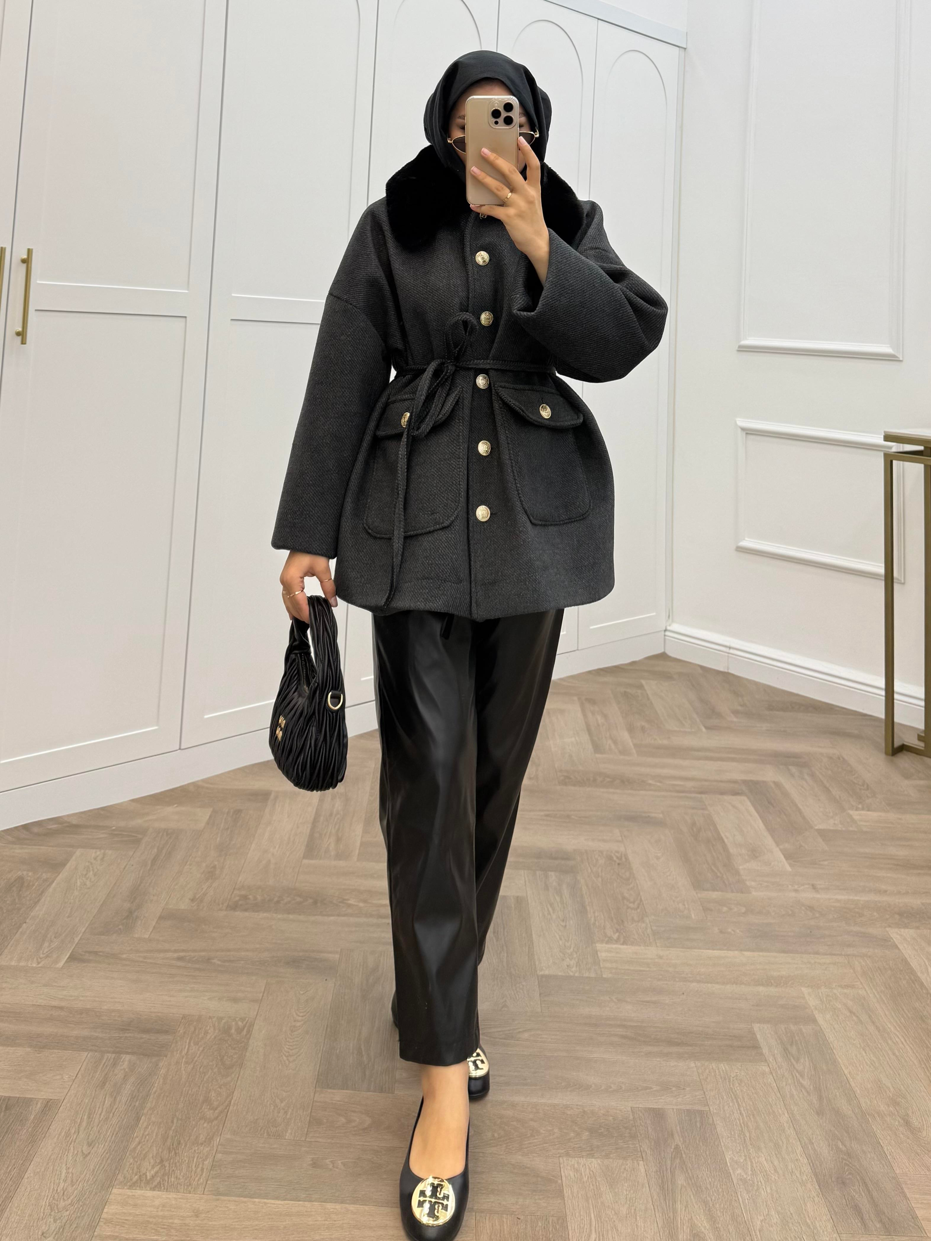 KÜRK YAKA GOLD DÜĞMELİ CEKET ANTRASİT