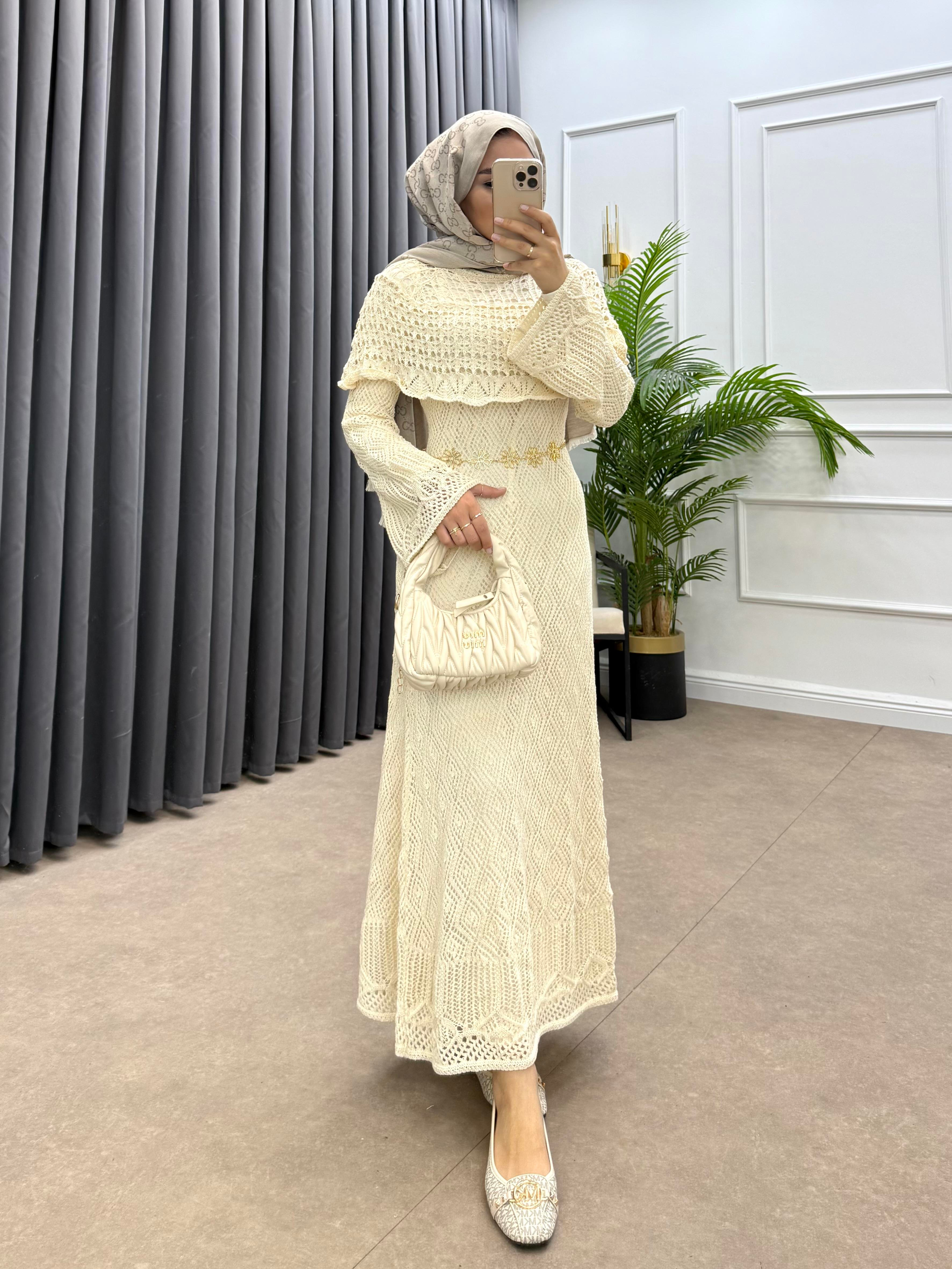 OMUZ DETAYLI FİLELİ ELBİSE TAŞ