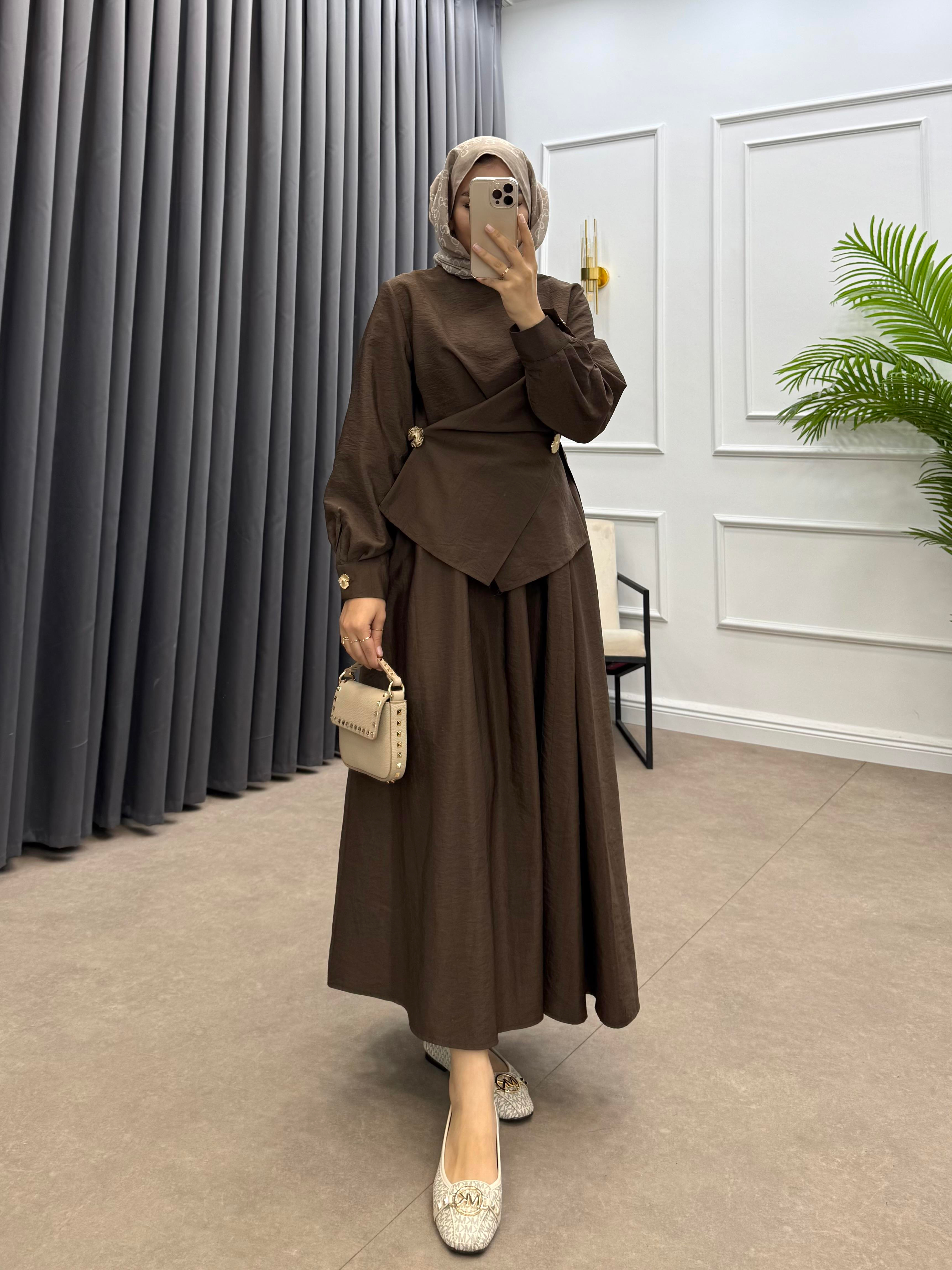 ÖNDEN ÇAPRAZ BAĞLAMALI ETEKLİ TAKIM KAHVE