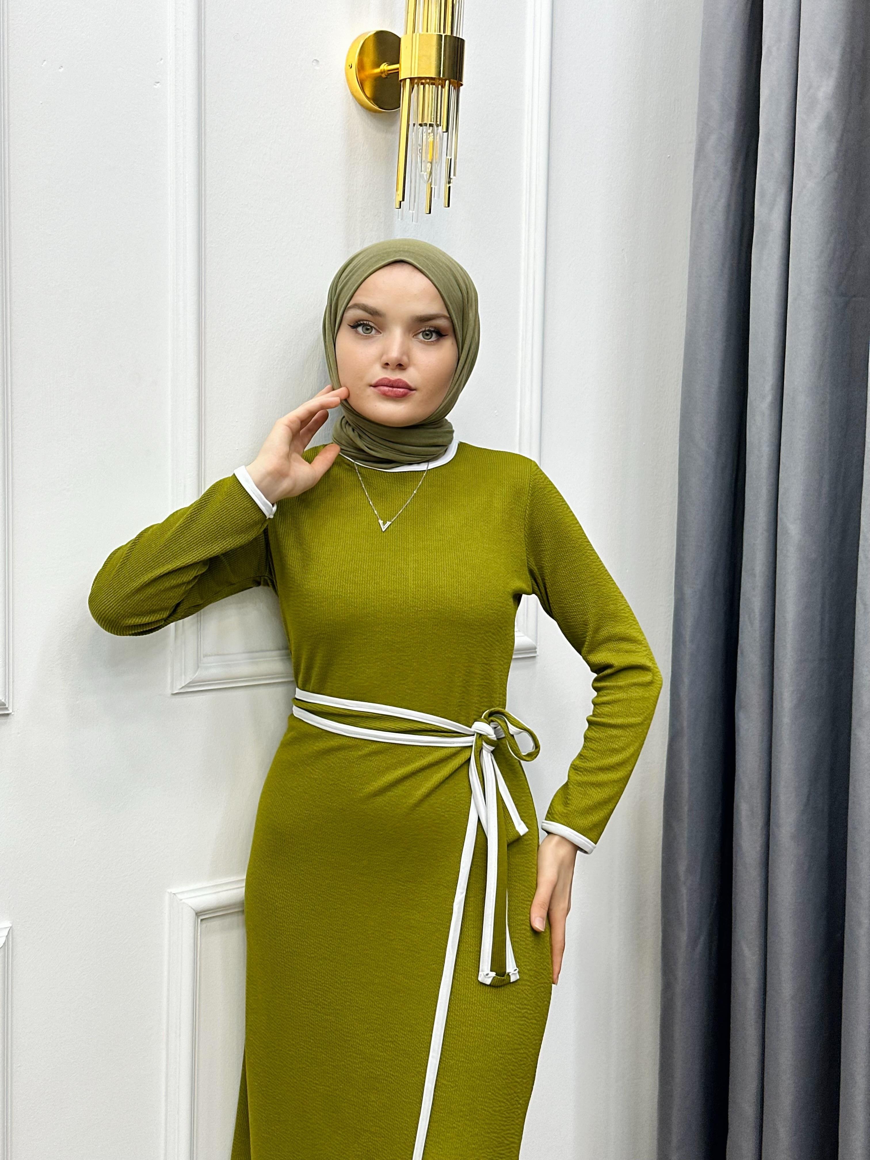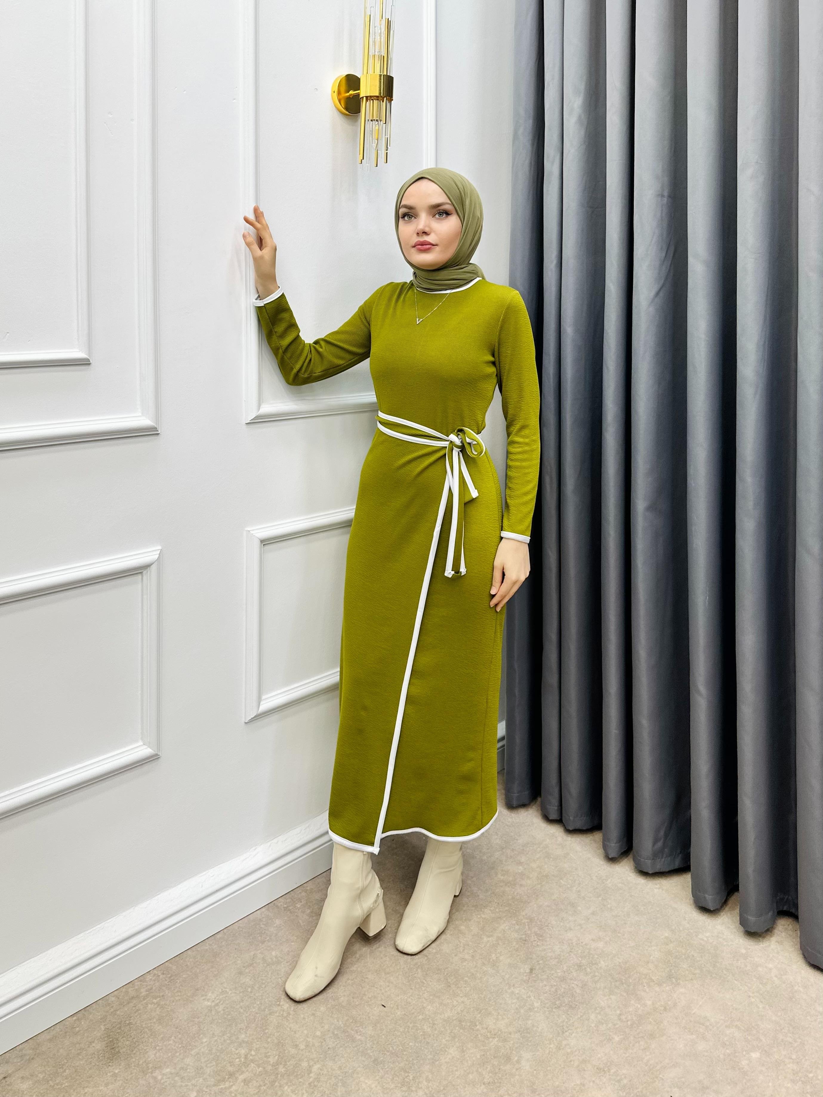 PARÇA DETAY BAĞLAMALI ELBİSE YAĞ YEŞİLİ
