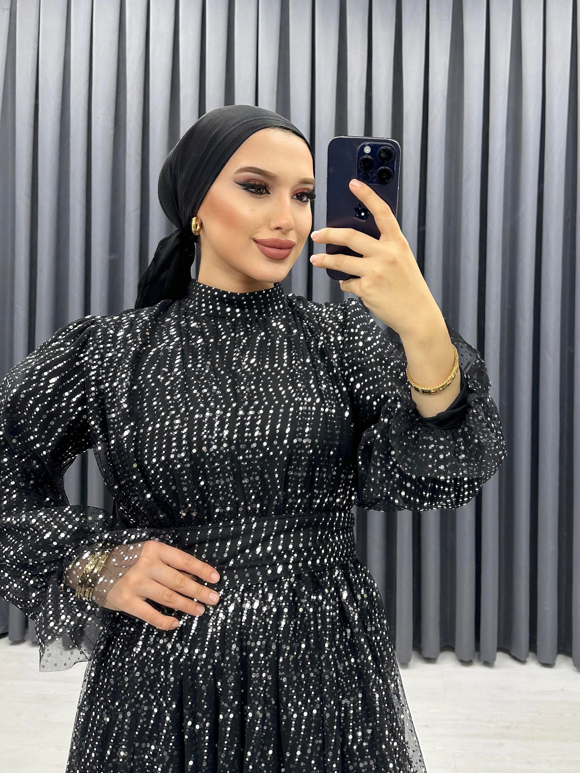 Kumaş Özelliği:PUL PAYETLİ TÜL Ürün Özelliği: TAM BOY ASTARLIDIR