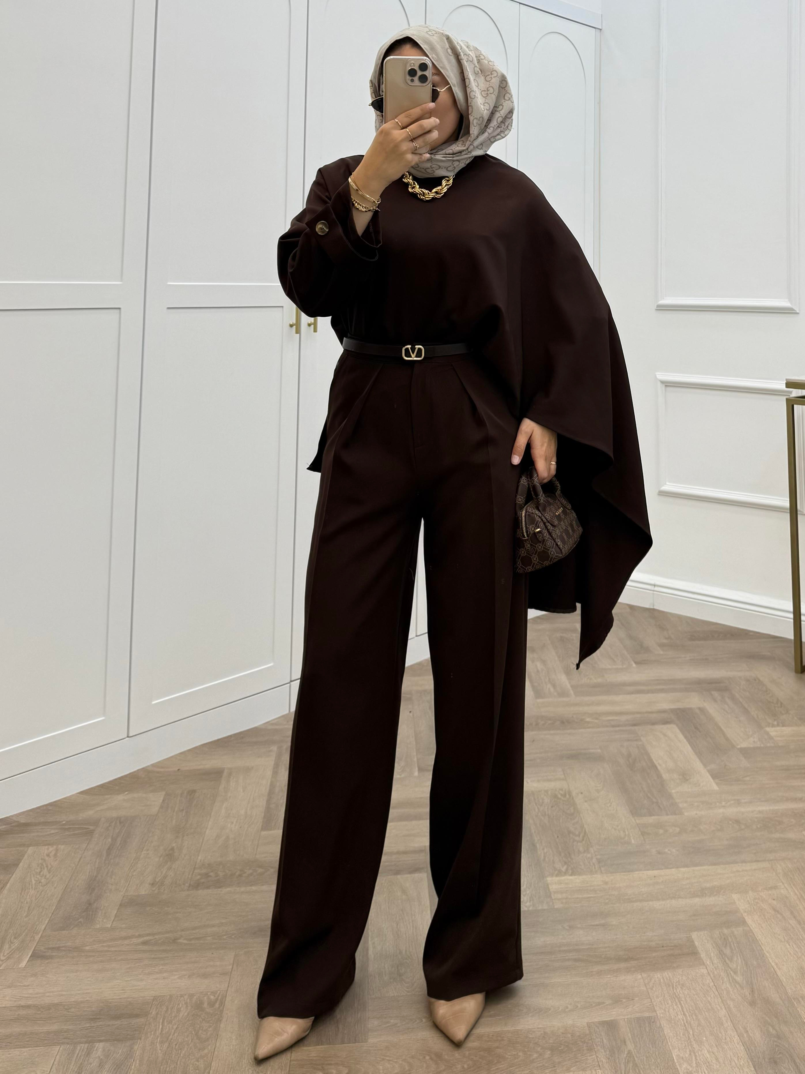 ŞAL DETAY KOL APOLETLİ PANTOLONLU TAKIM KAHVE