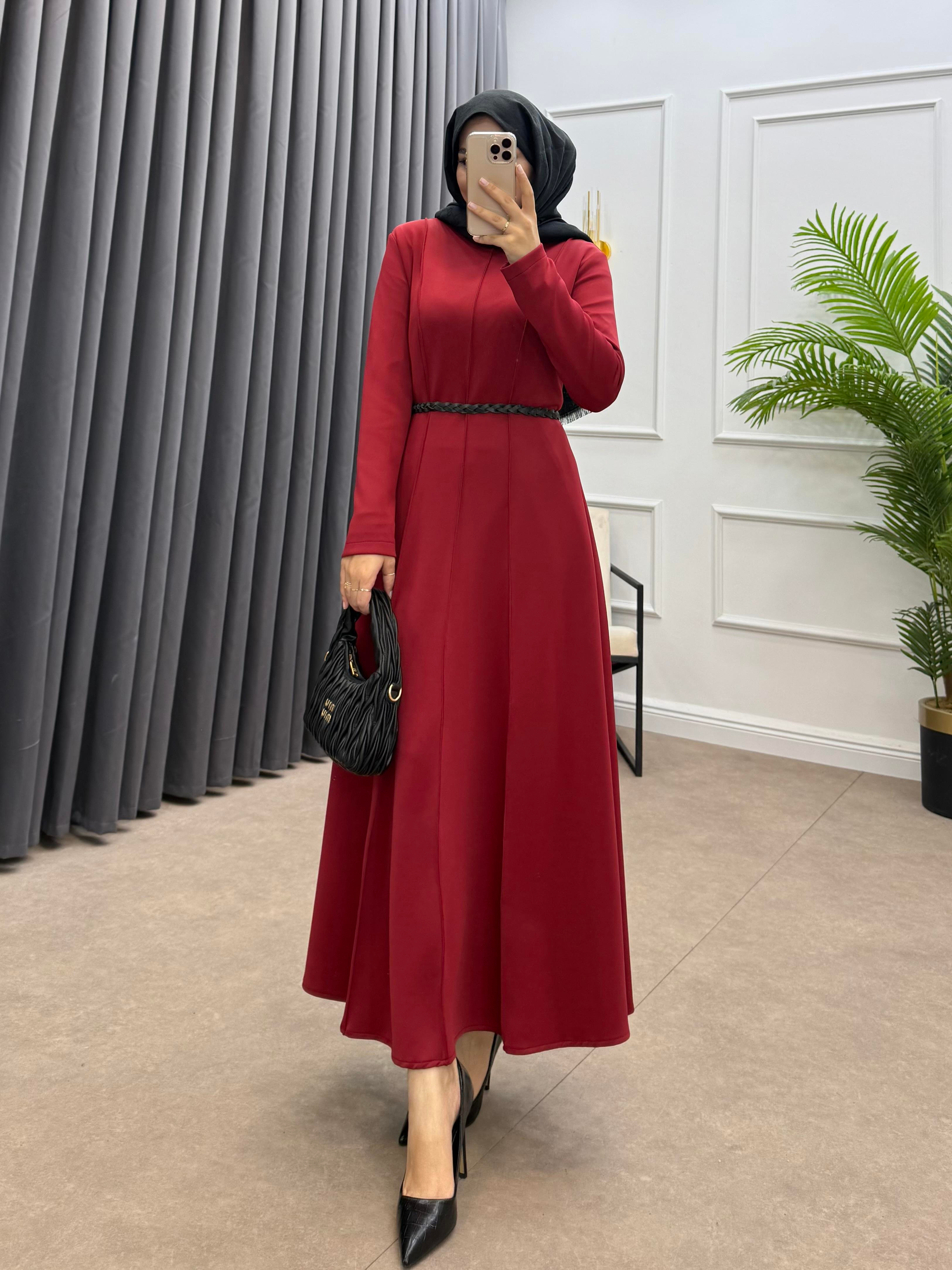 SCUBA ÖRGÜ KEMERLİ ELBİSE BORDO