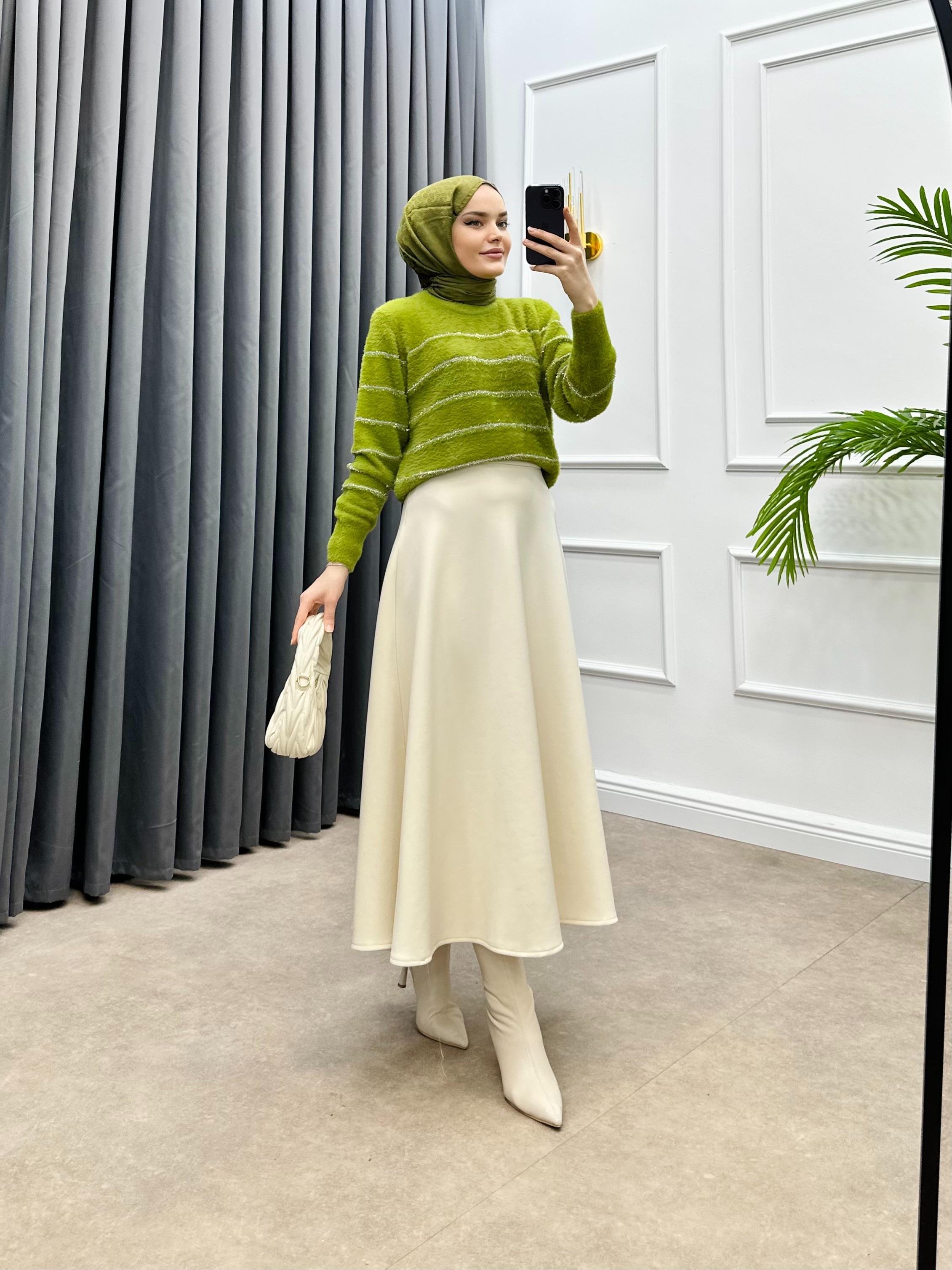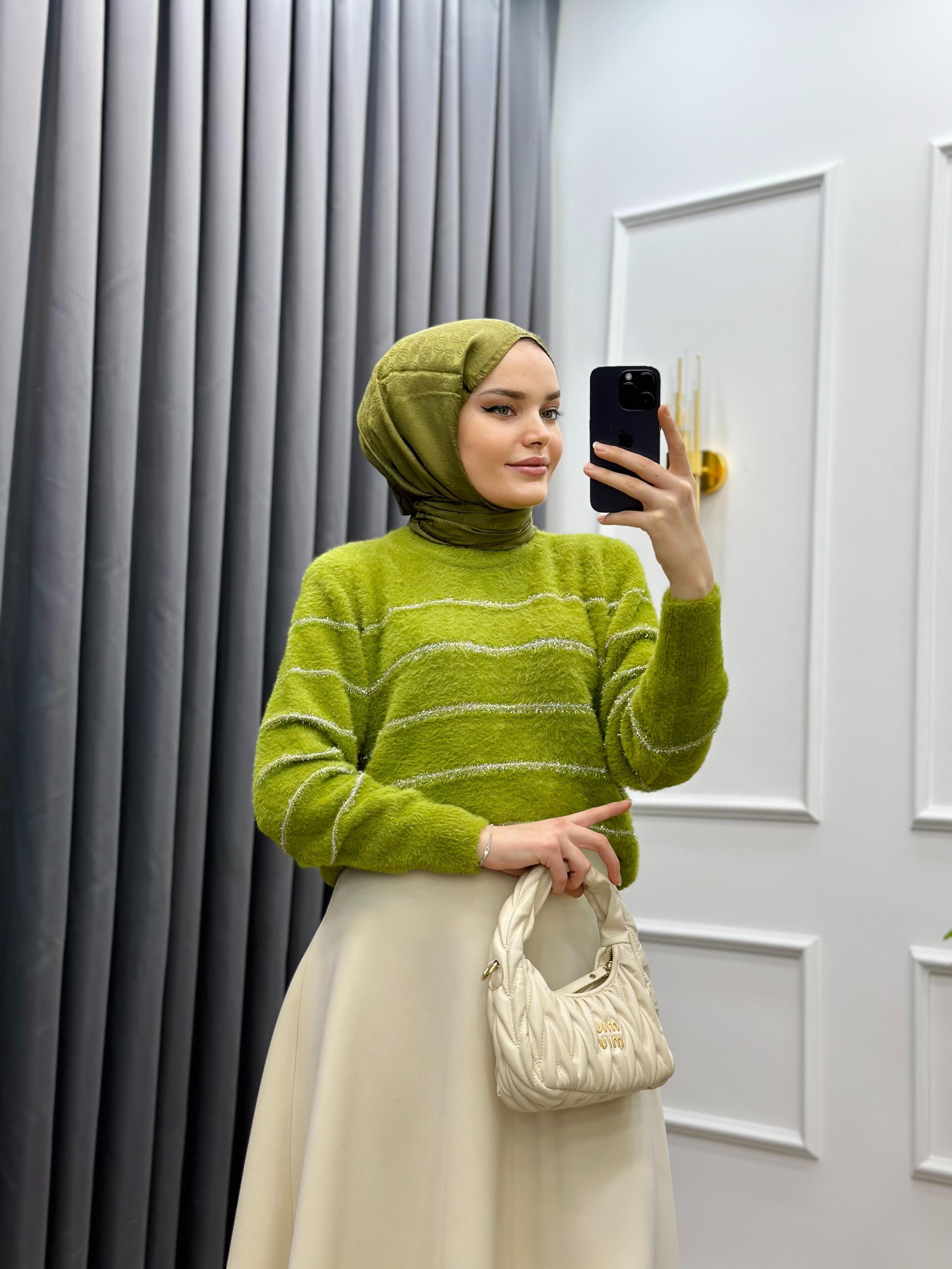 ŞERİTLİ YUMOŞ TRİKO KAZAK FISTIK YEŞİLİ
