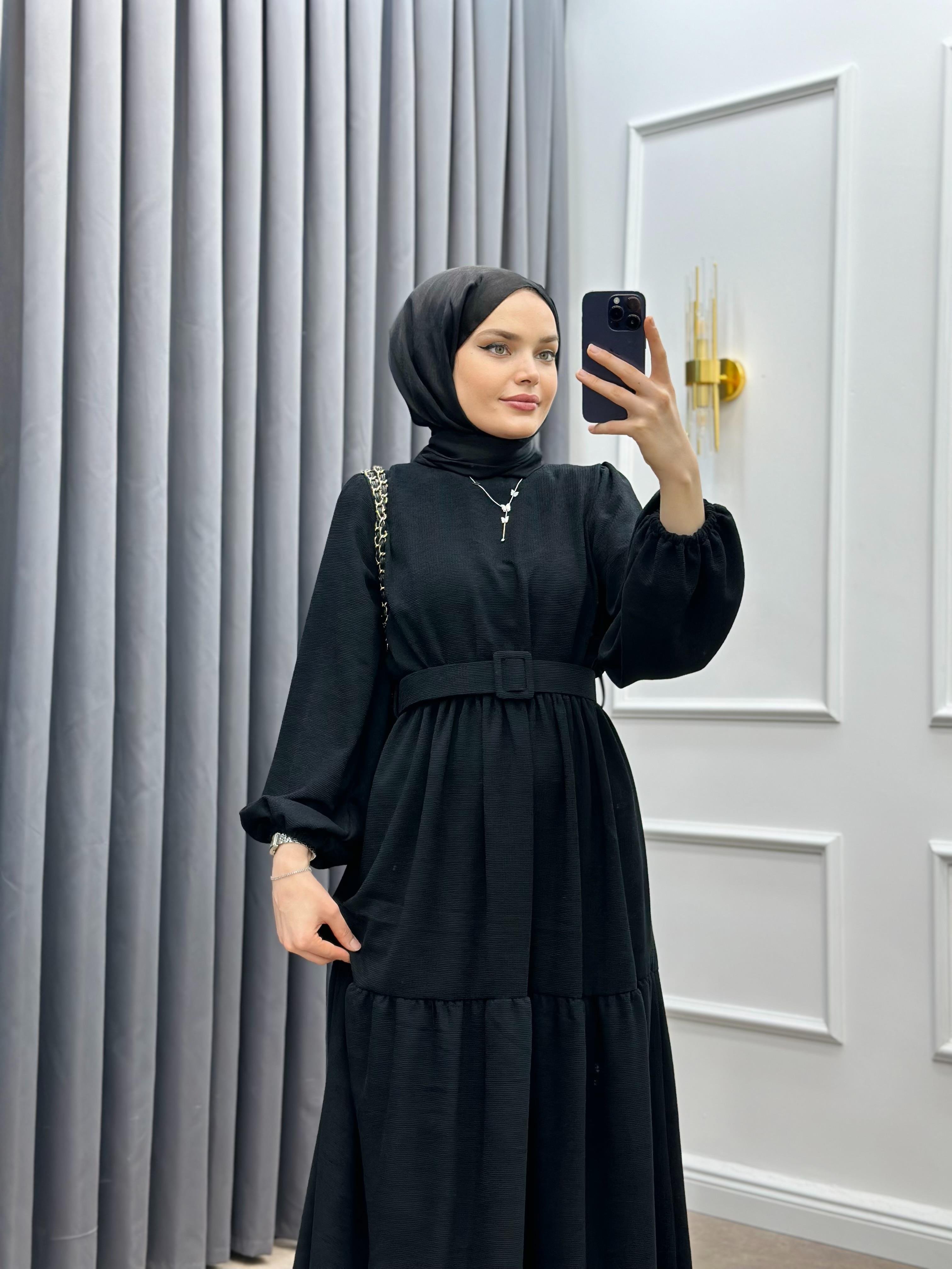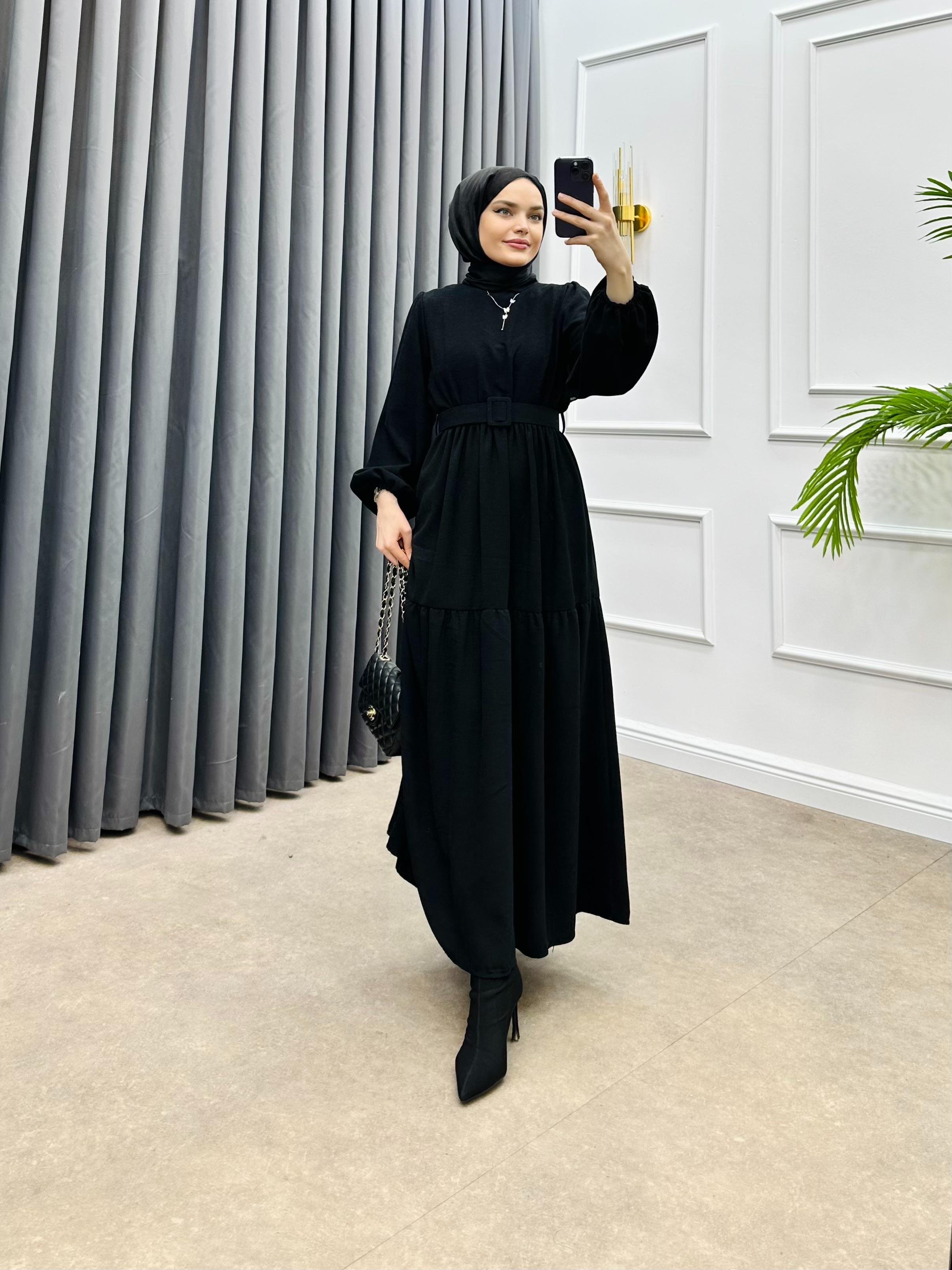 SEYYAR KEMERLİ FİTİLLİ KAFİDE ELBİSE SİYAH