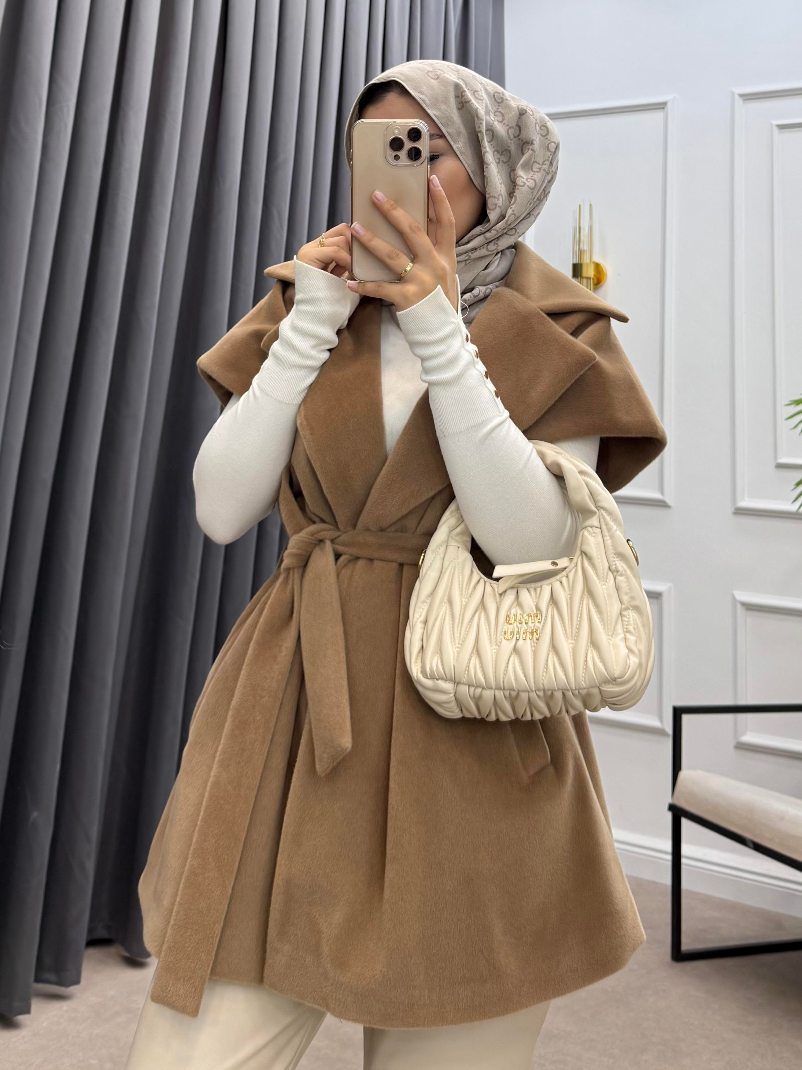 TAY TÜYÜ KEMERLİ YELEK CAMEL