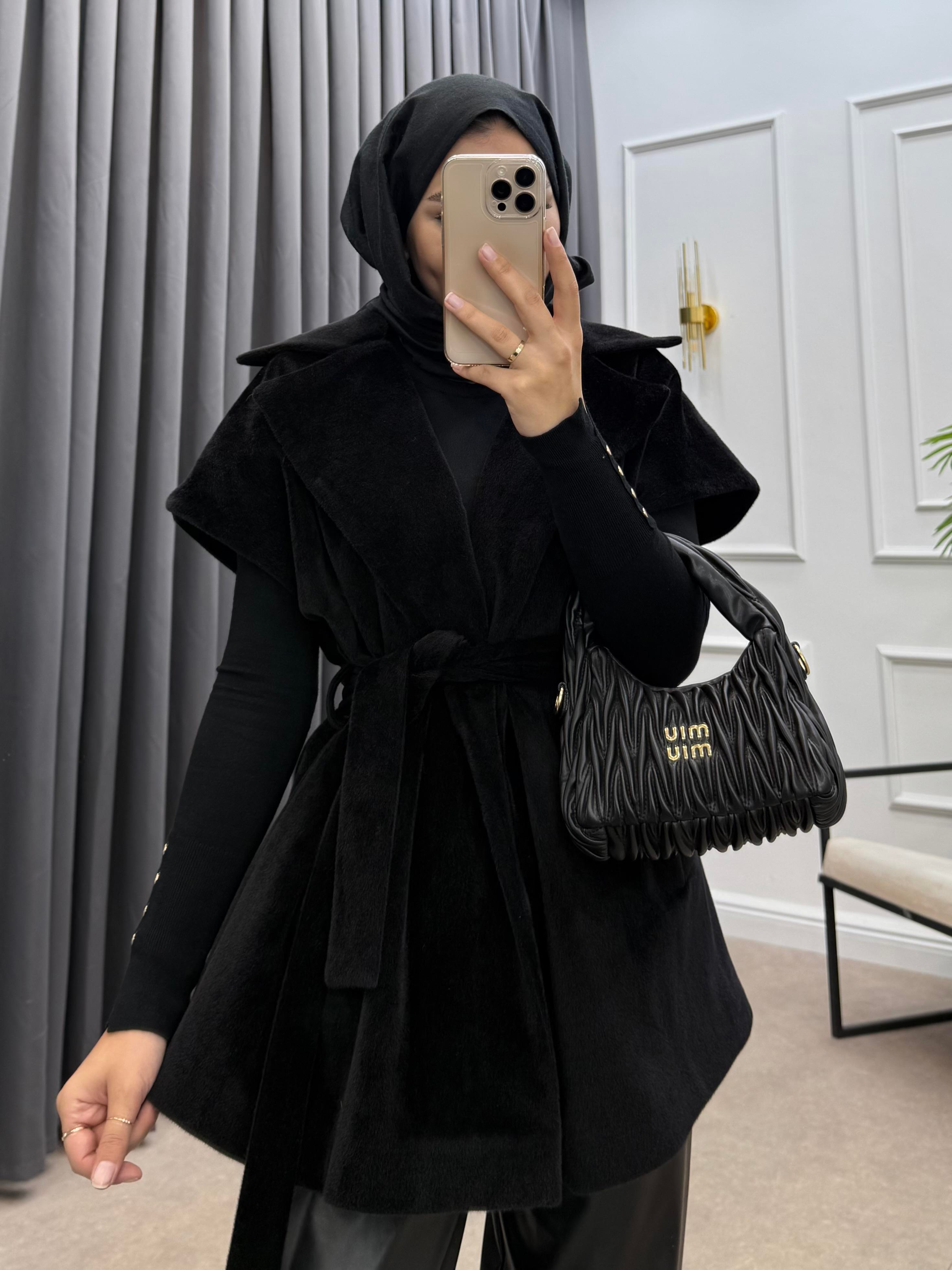TAY TÜYÜ KEMERLİ YELEK SİYAH