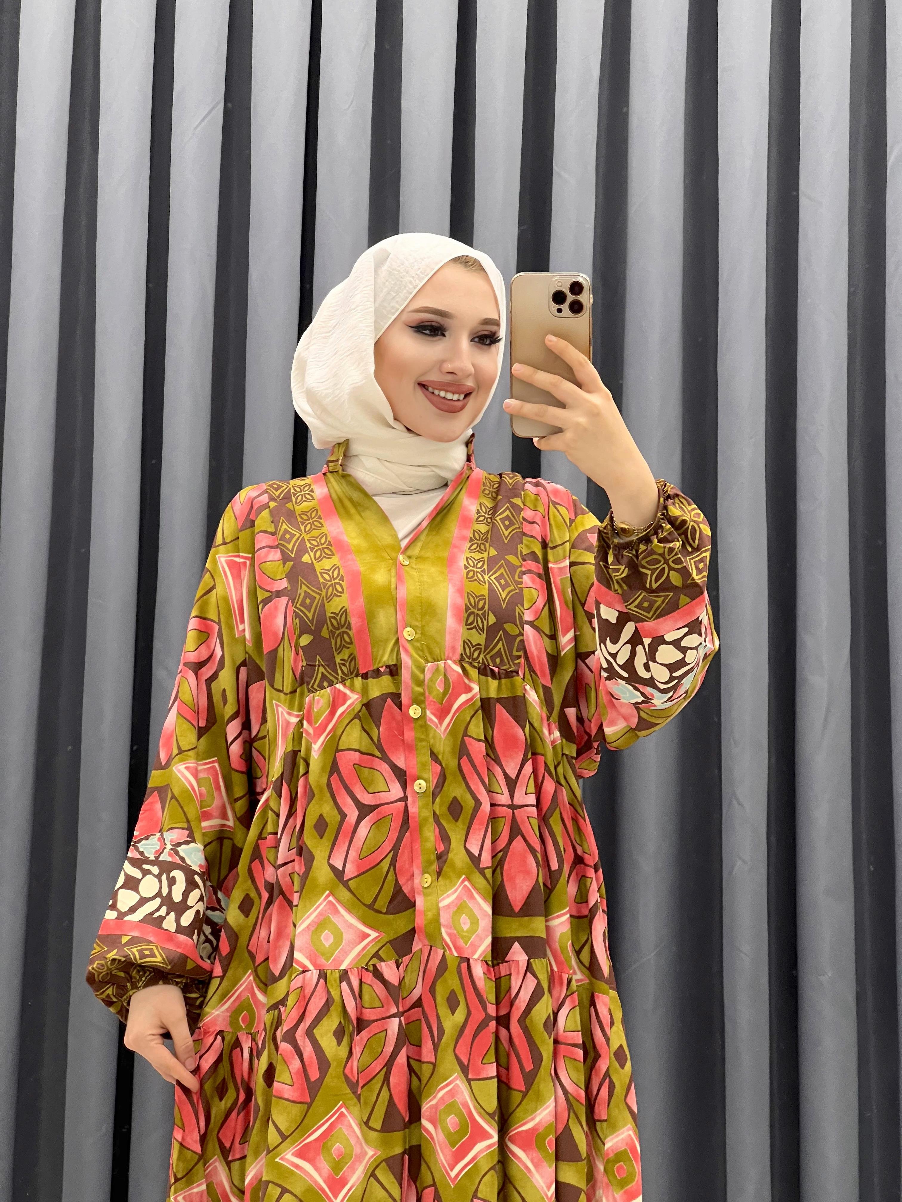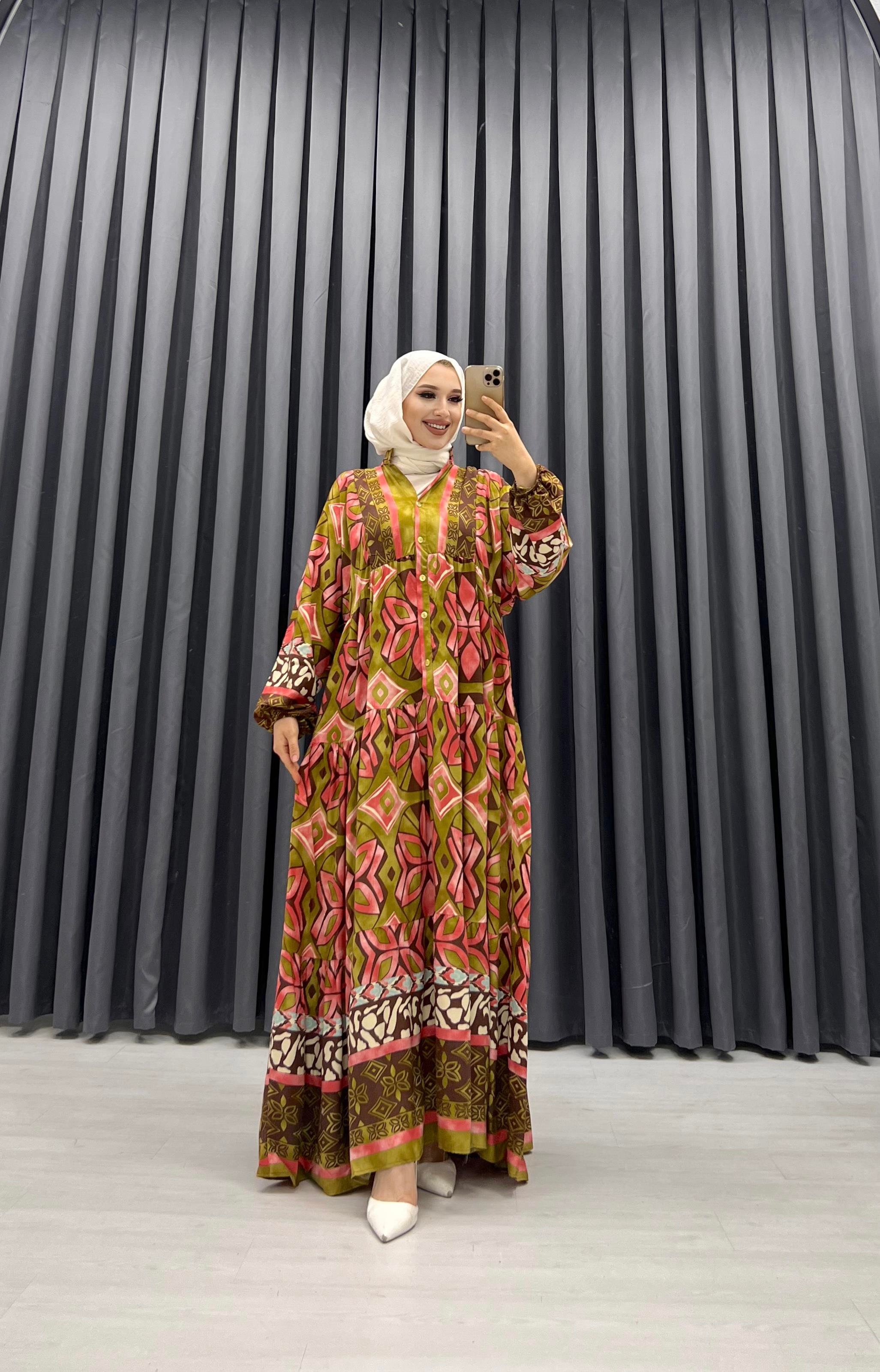 VİSKON DESENLİ ELBİSE PUDRA/YAĞ YEŞİLİ