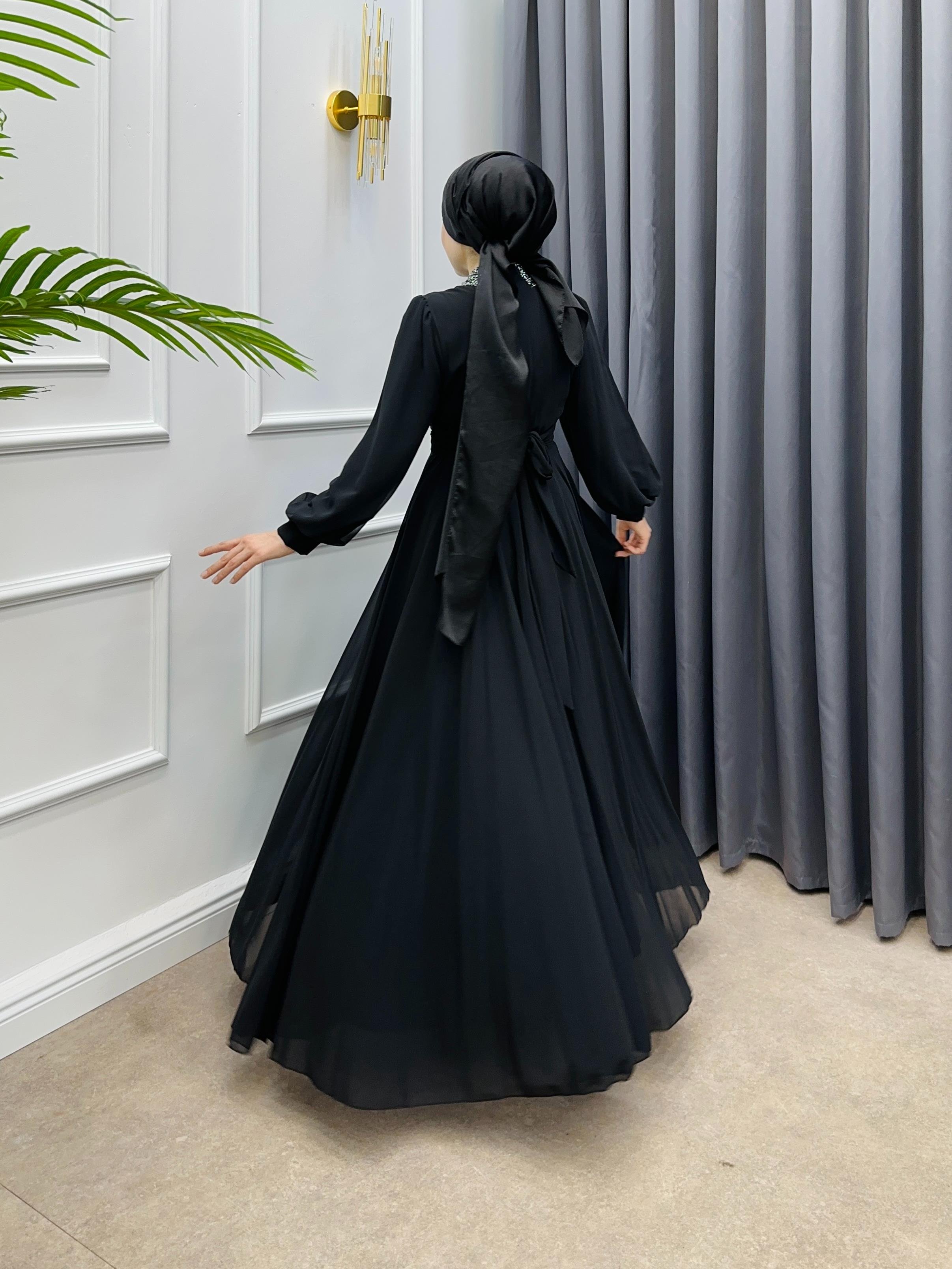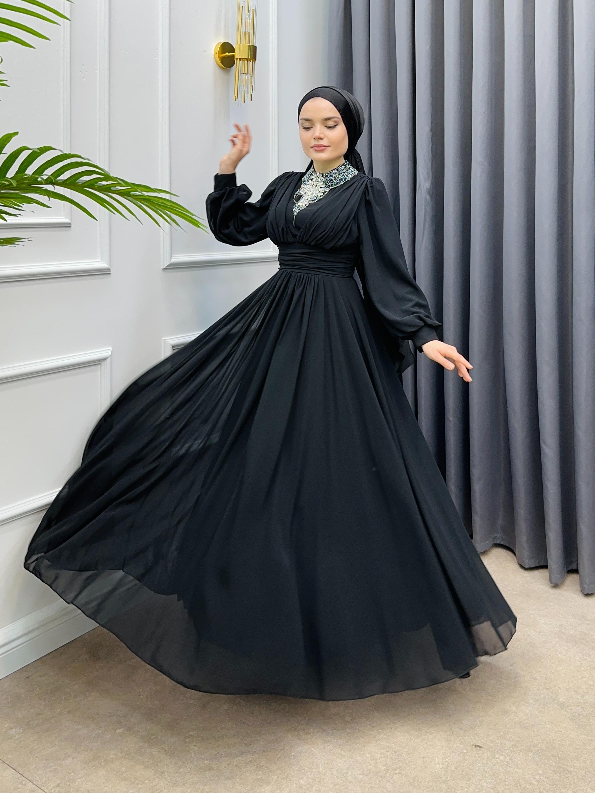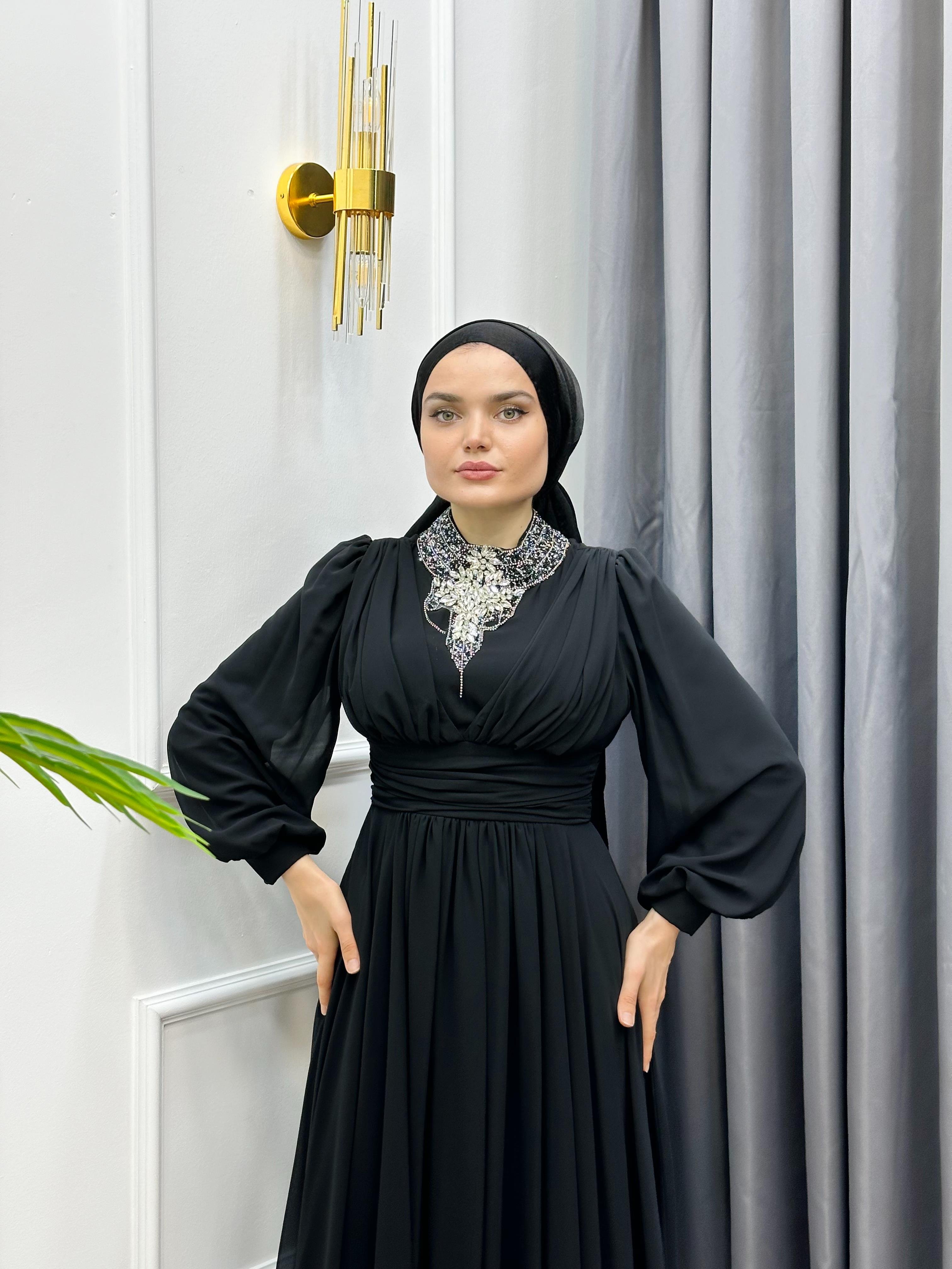 YAKASI TAŞ DETAY ŞİFON ELBİSE SİYAH