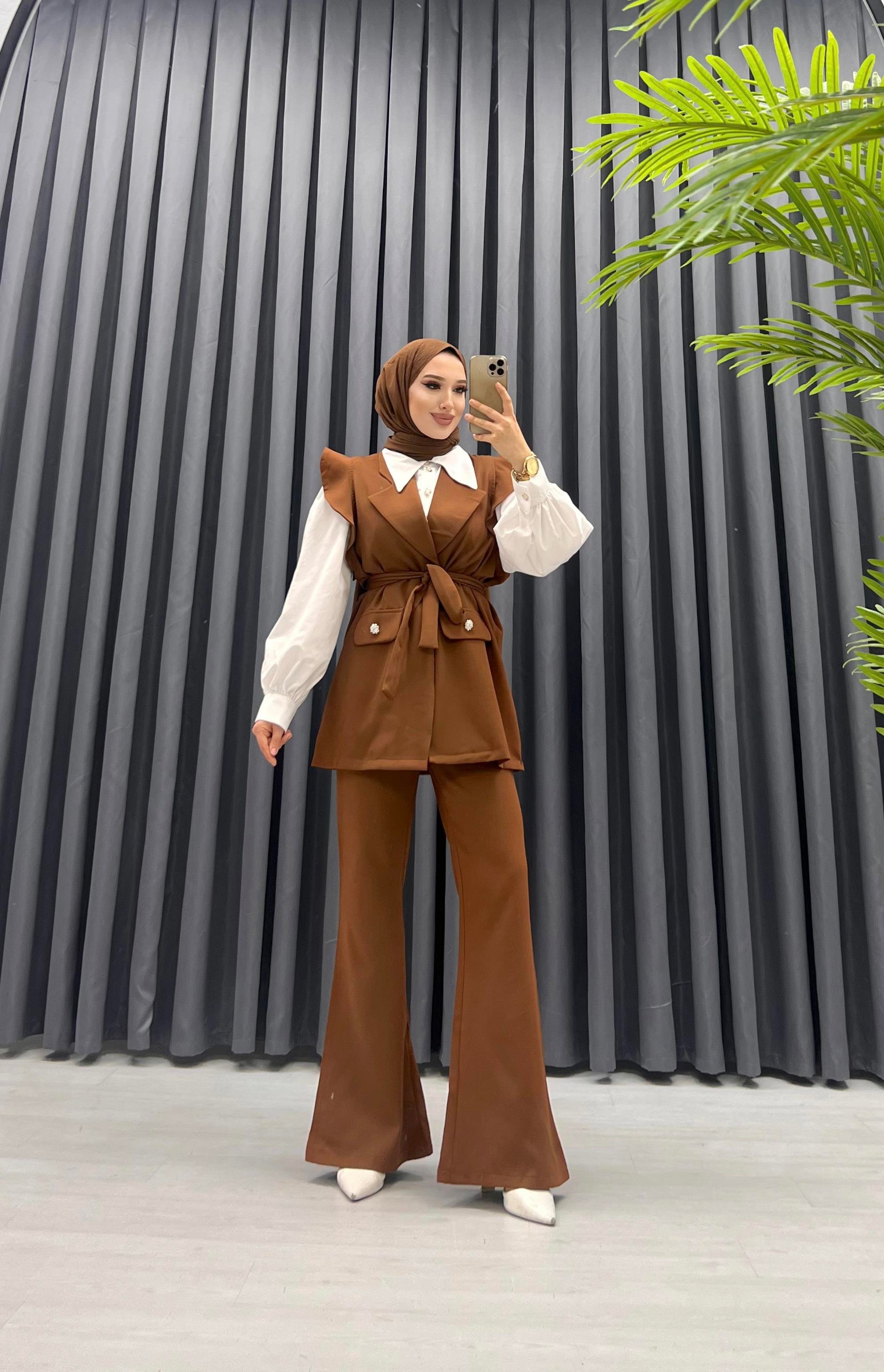 YELEKLİ PANTOLONLU TAKIM KAHVE
