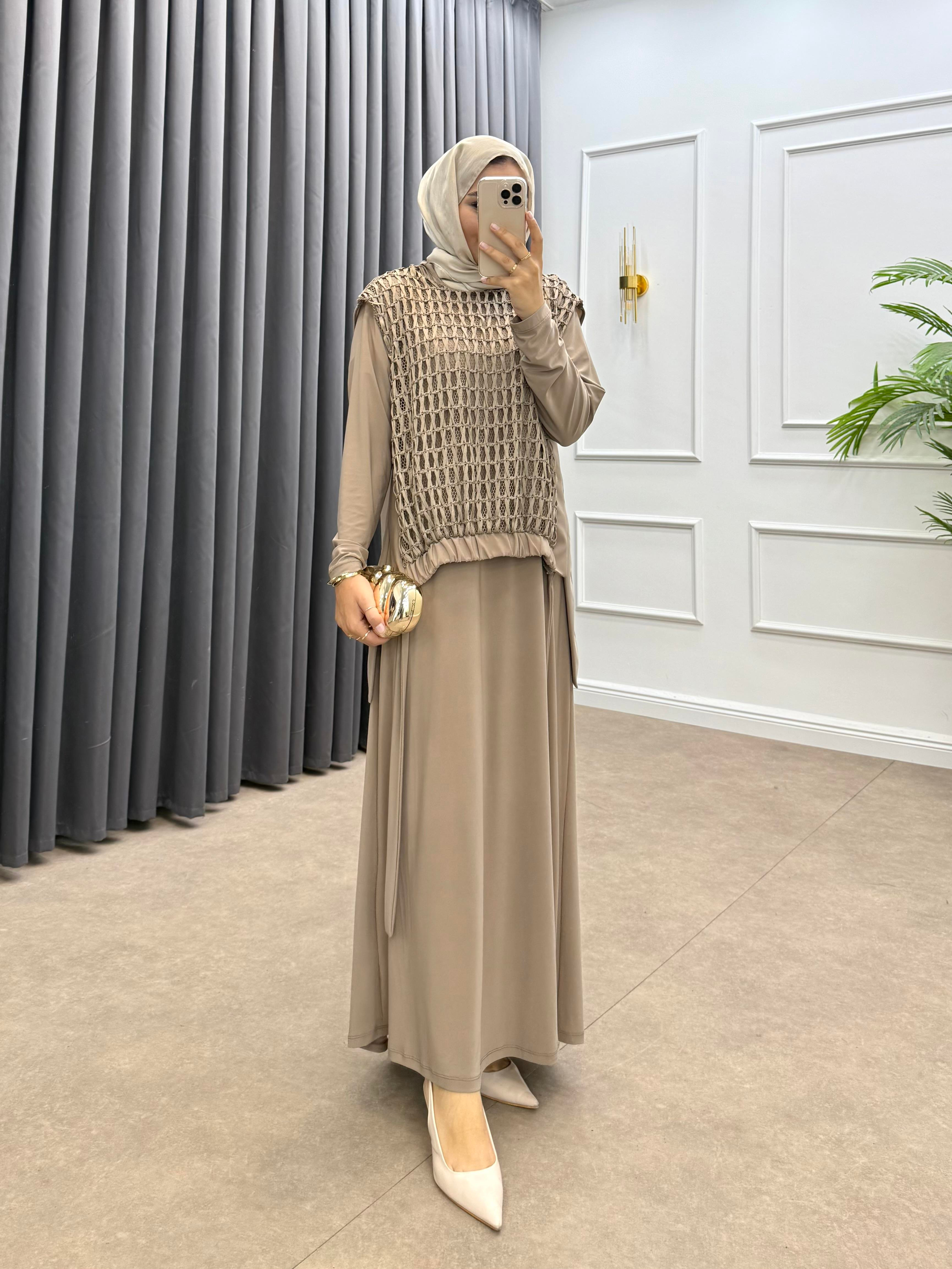 Ürün Yapısı: İki parça elbise – Şık ve rahat kullanım sunar. Kumaş Bilgisi: SANDY/FİLE KUMAŞ– Hafif, nefes alabilen ve konforlu bir yapıdadır. Detaylar: