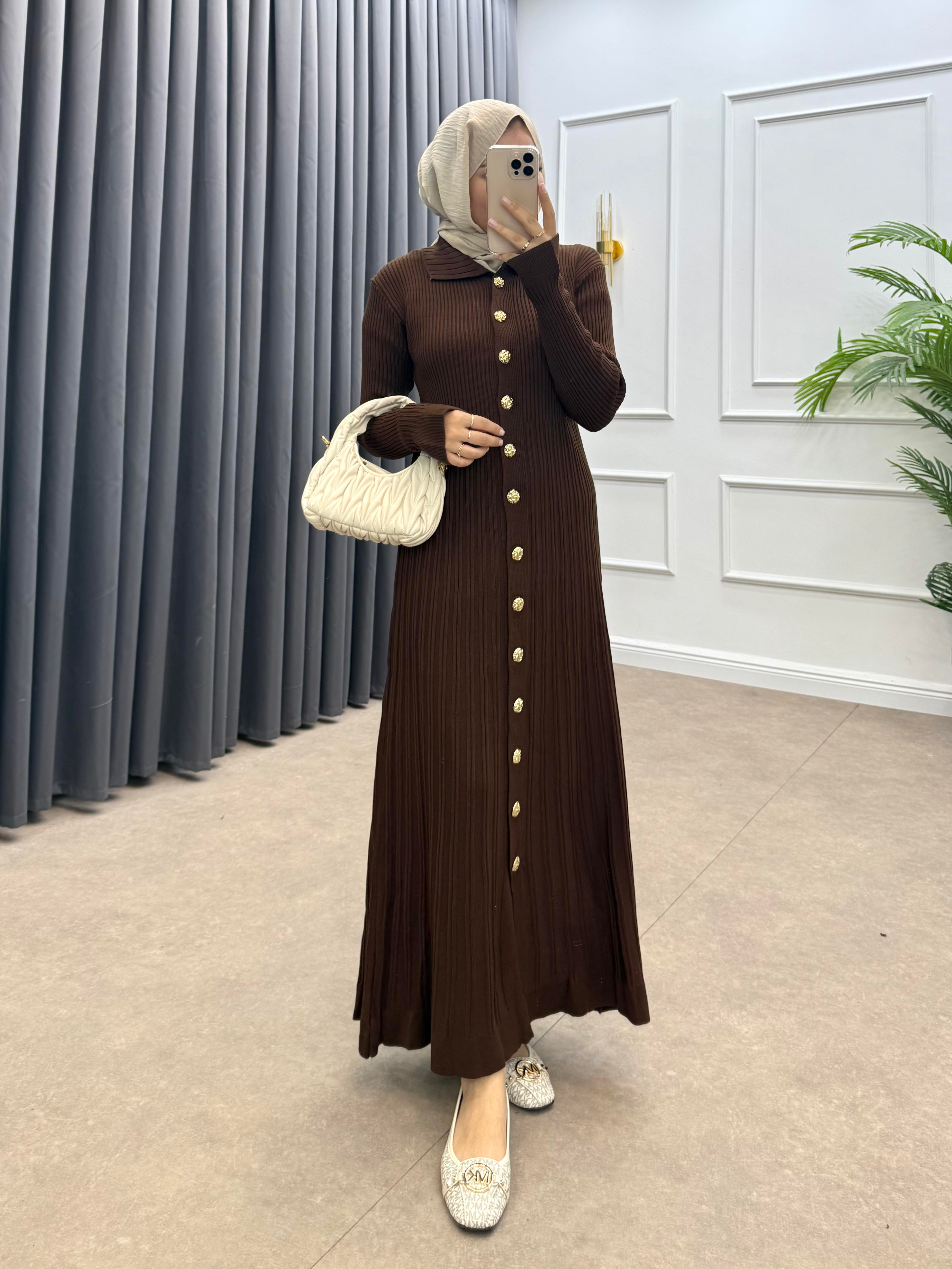 GOLD DÜĞMELİ TRİKO ELBİSE KAHVE