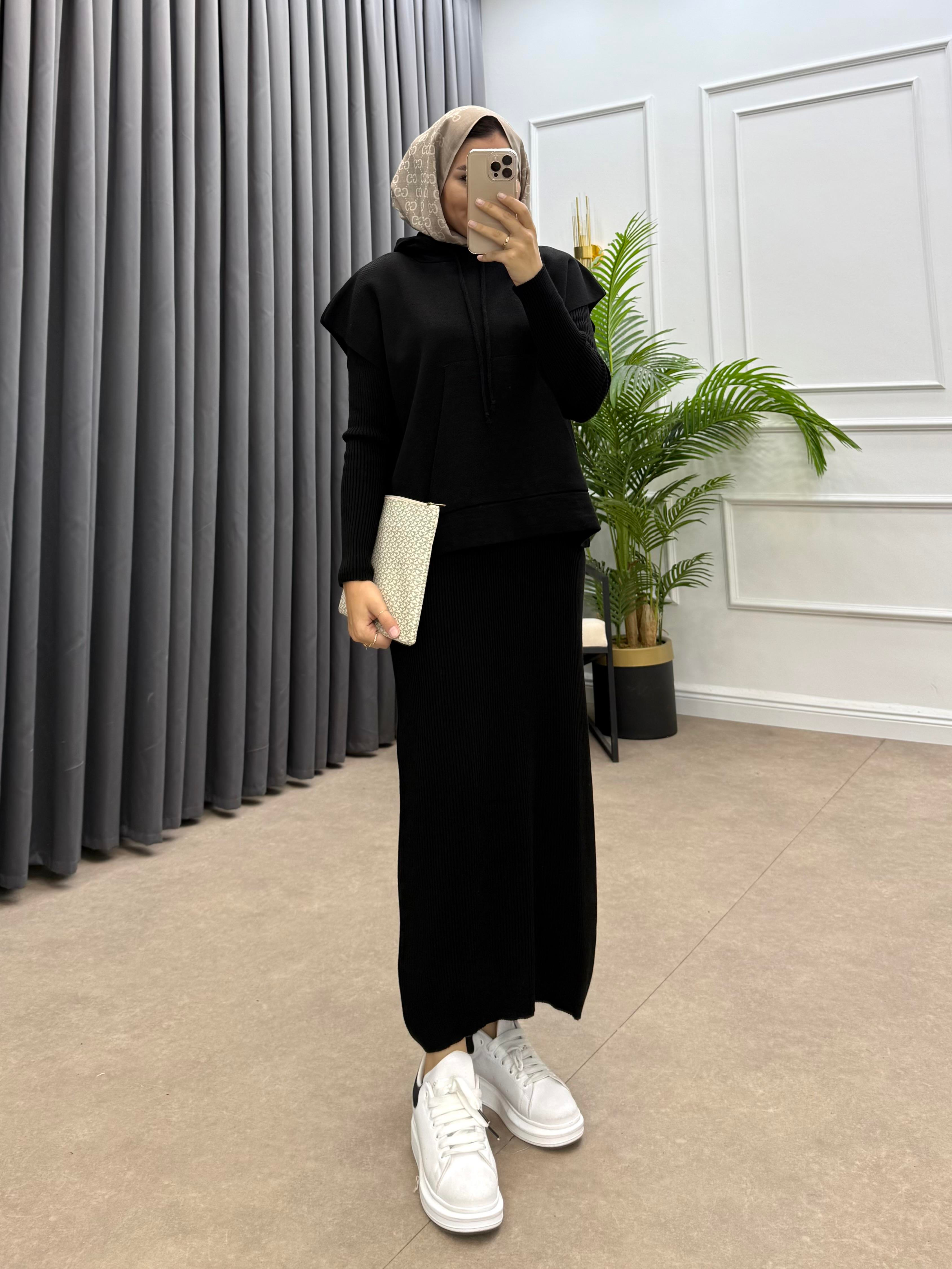 KAPÜŞONLU SÜVETERLİ TRİKO ELBİSE SİYAH