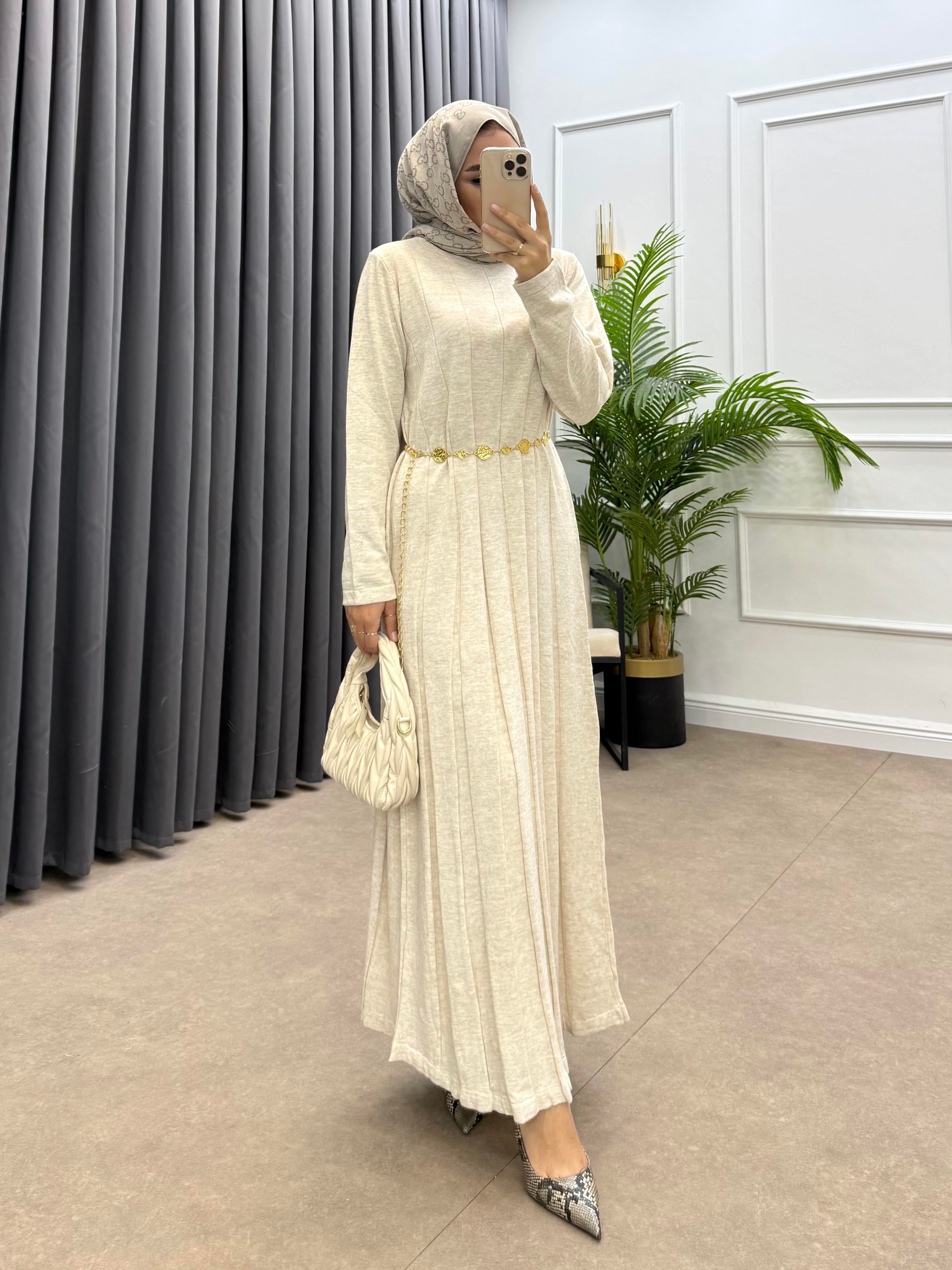 ŞERİTLİ KEMERLİ TRİKO ELBİSE BEJ
