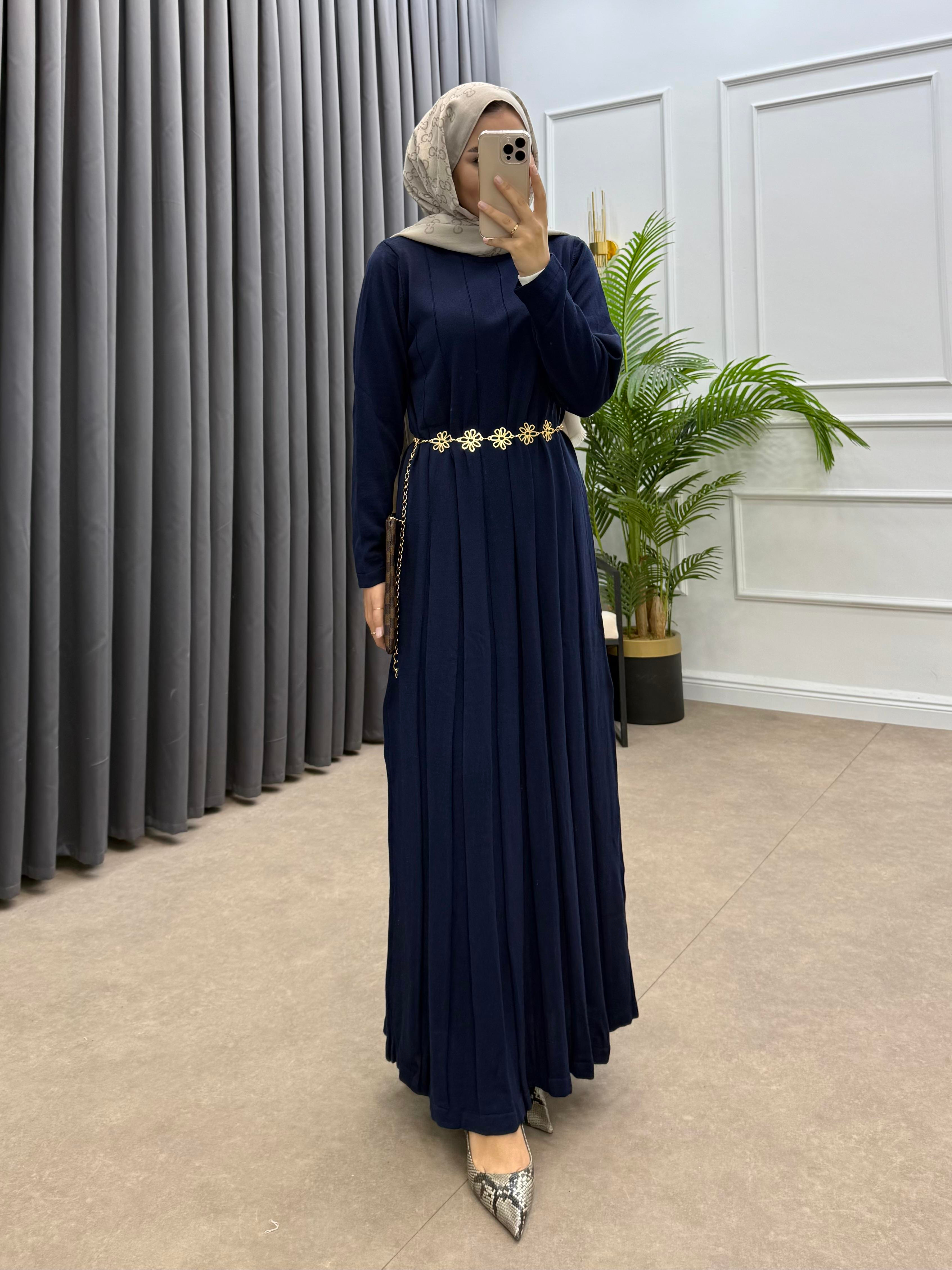 ŞERİTLİ KEMERLİ TRİKO ELBİSE LACİVERT