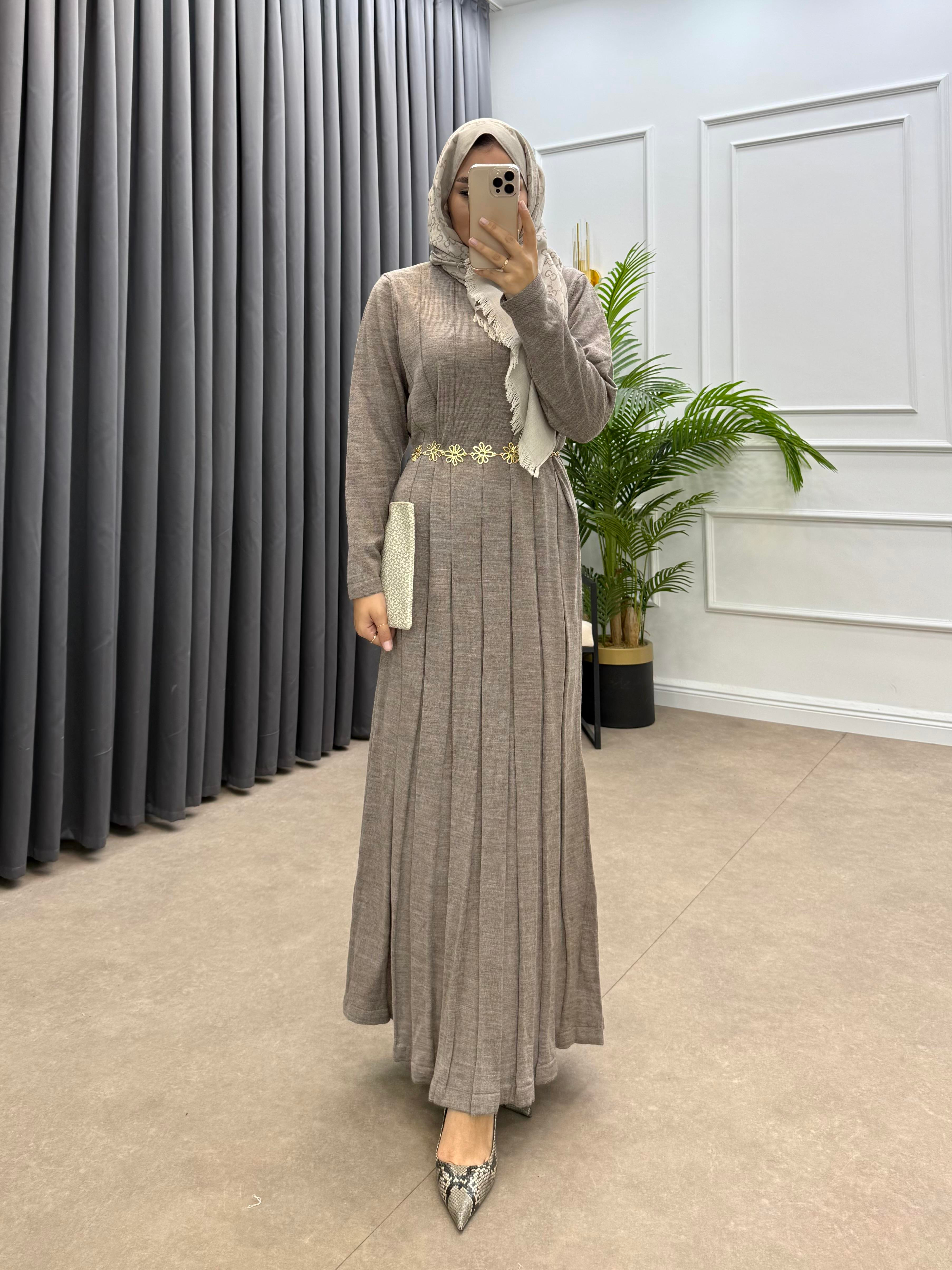 ŞERİTLİ KEMERLİ TRİKO ELBİSE VİZON