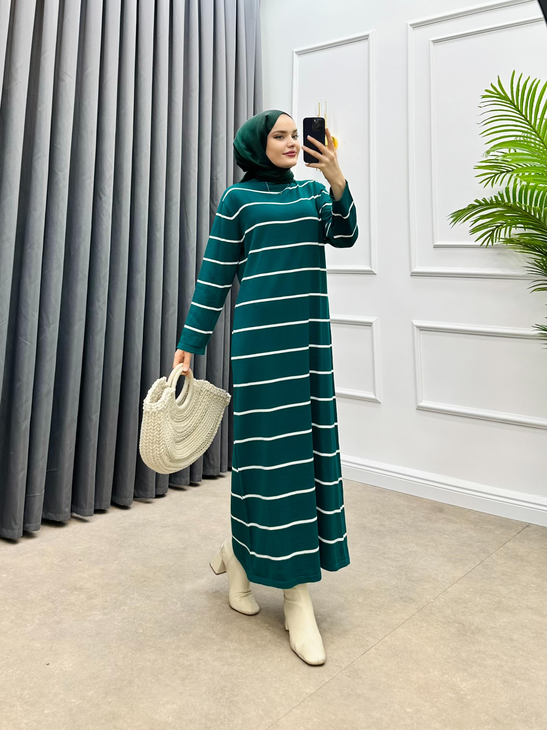 SOSİS YAKA ÇİZGİLİ TRİKO ELBİSE ZÜMRÜT