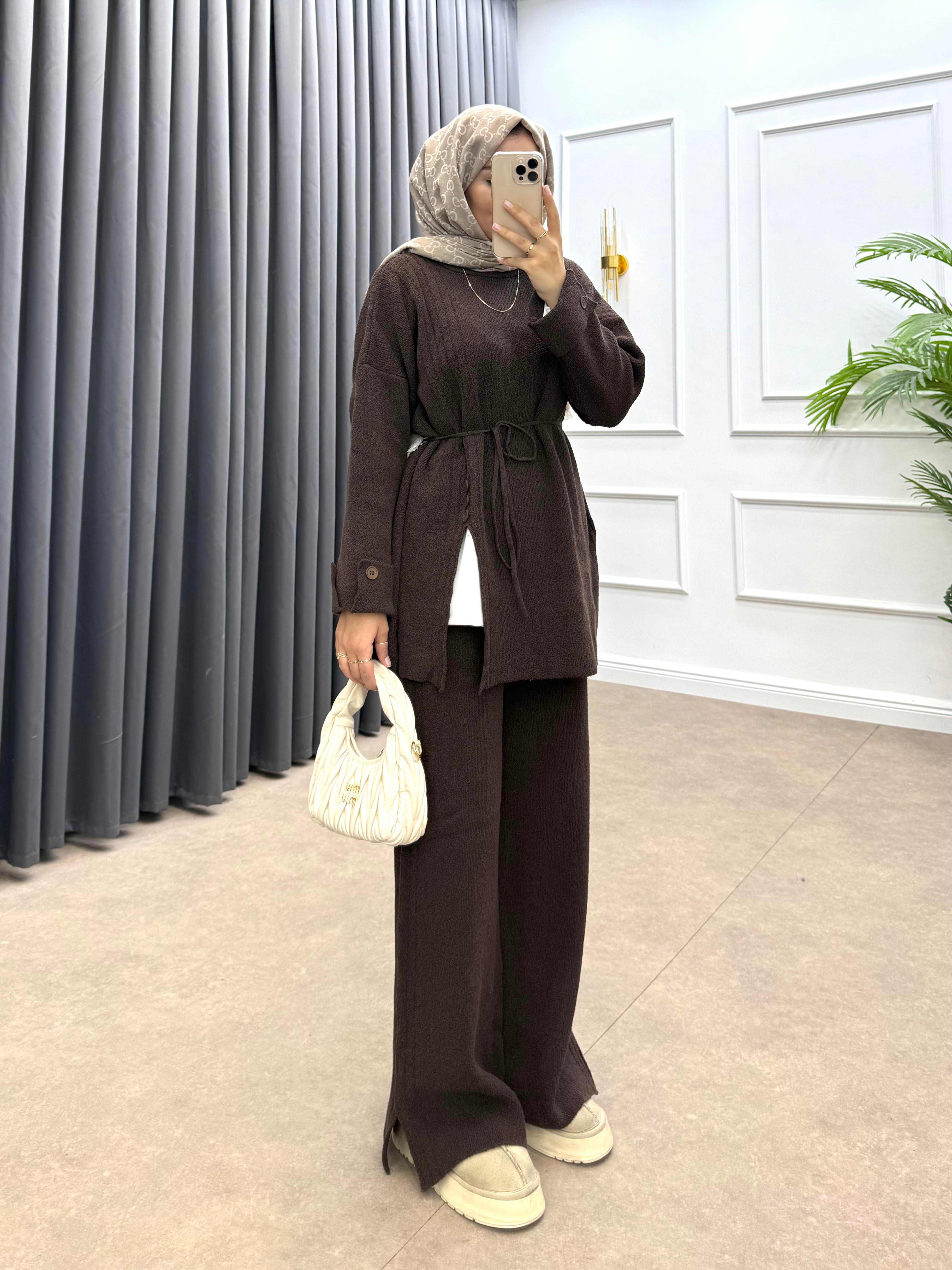 ÜÇ DÜĞME DETAYLI TRİKO TAKIM KAHVE