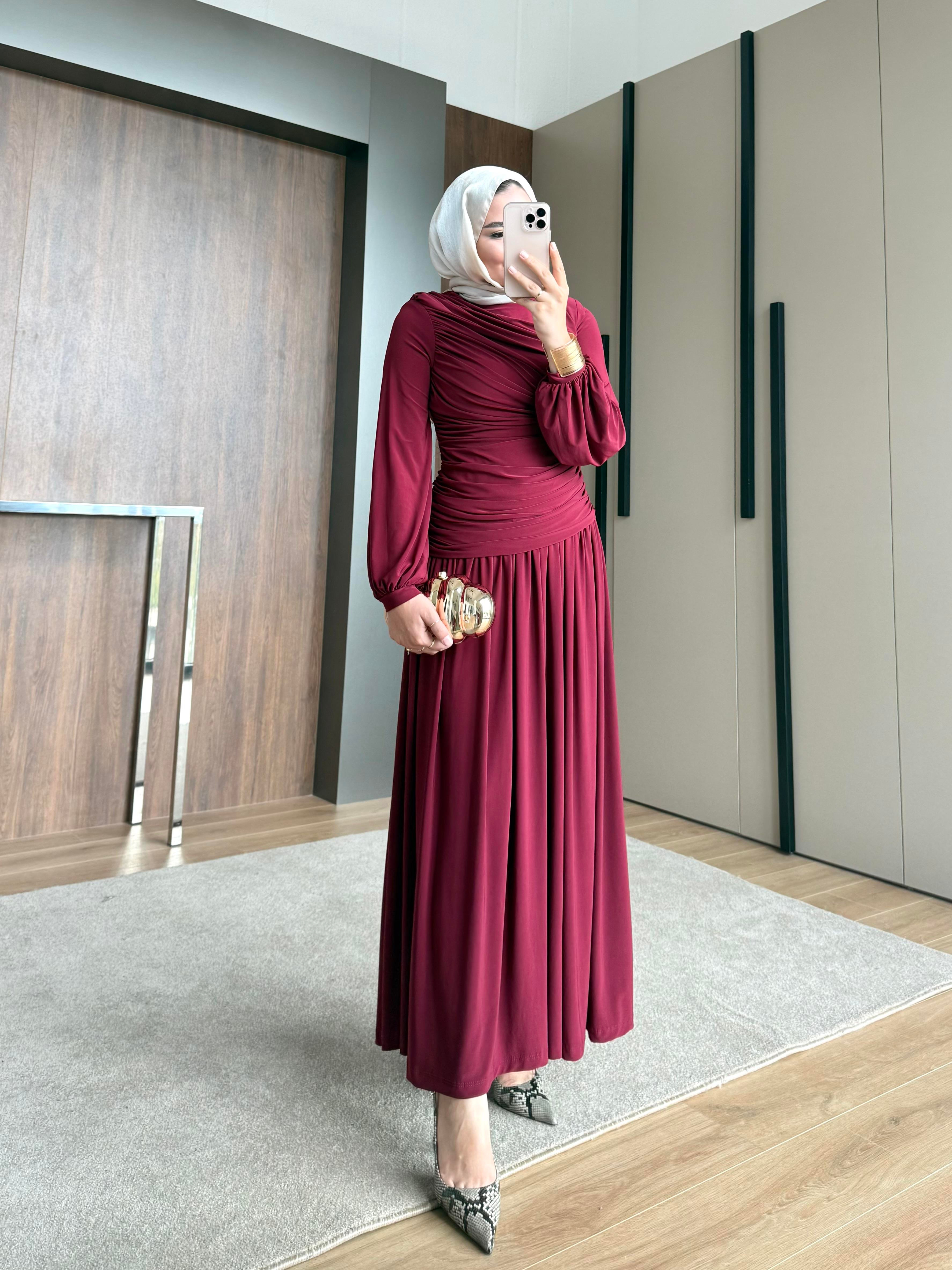 YANDAN BÜZGÜLÜ SANDY ELBİSE BORDO