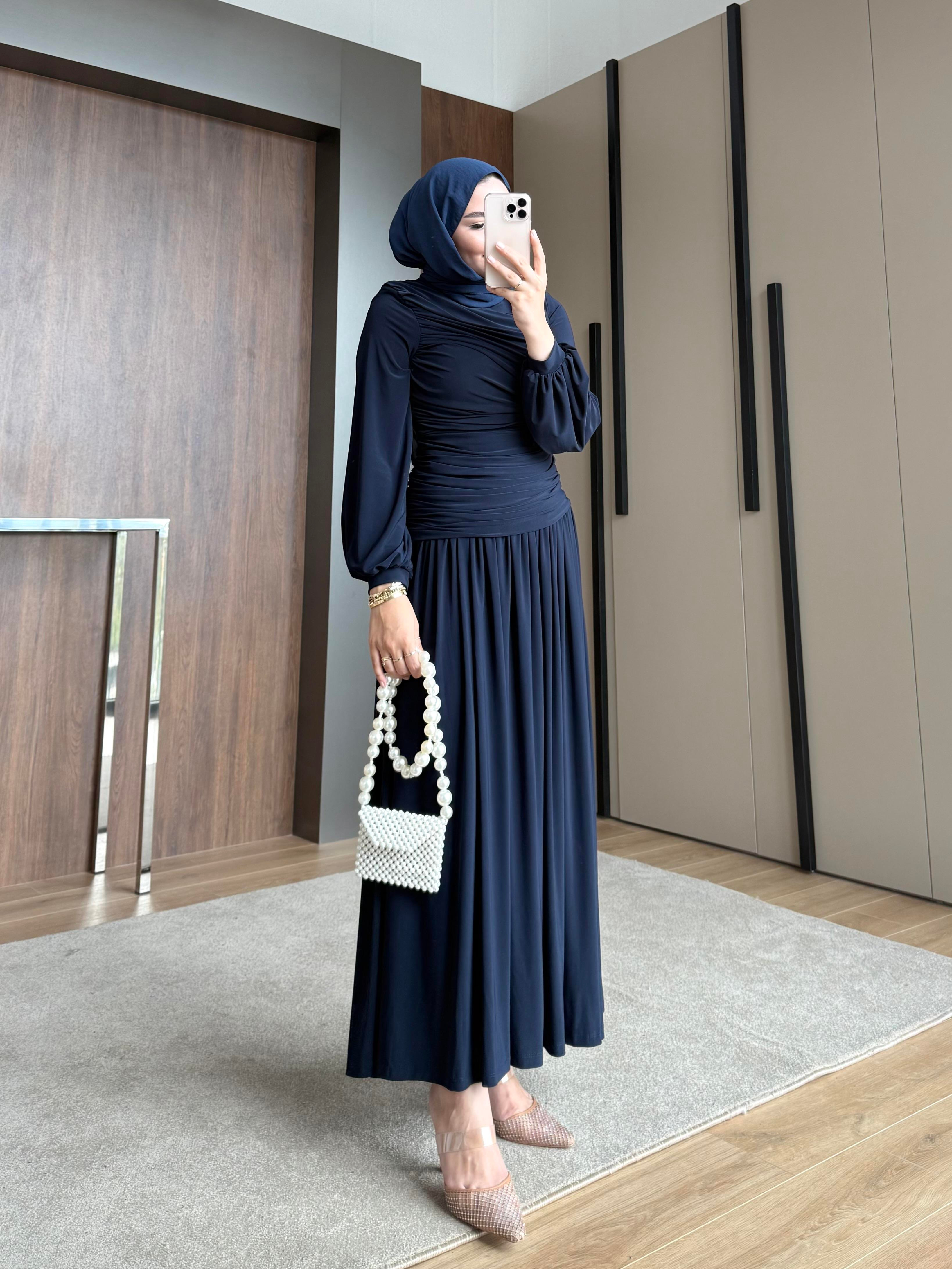 YANDAN BÜZGÜLÜ SANDY ELBİSE LACİVERT
