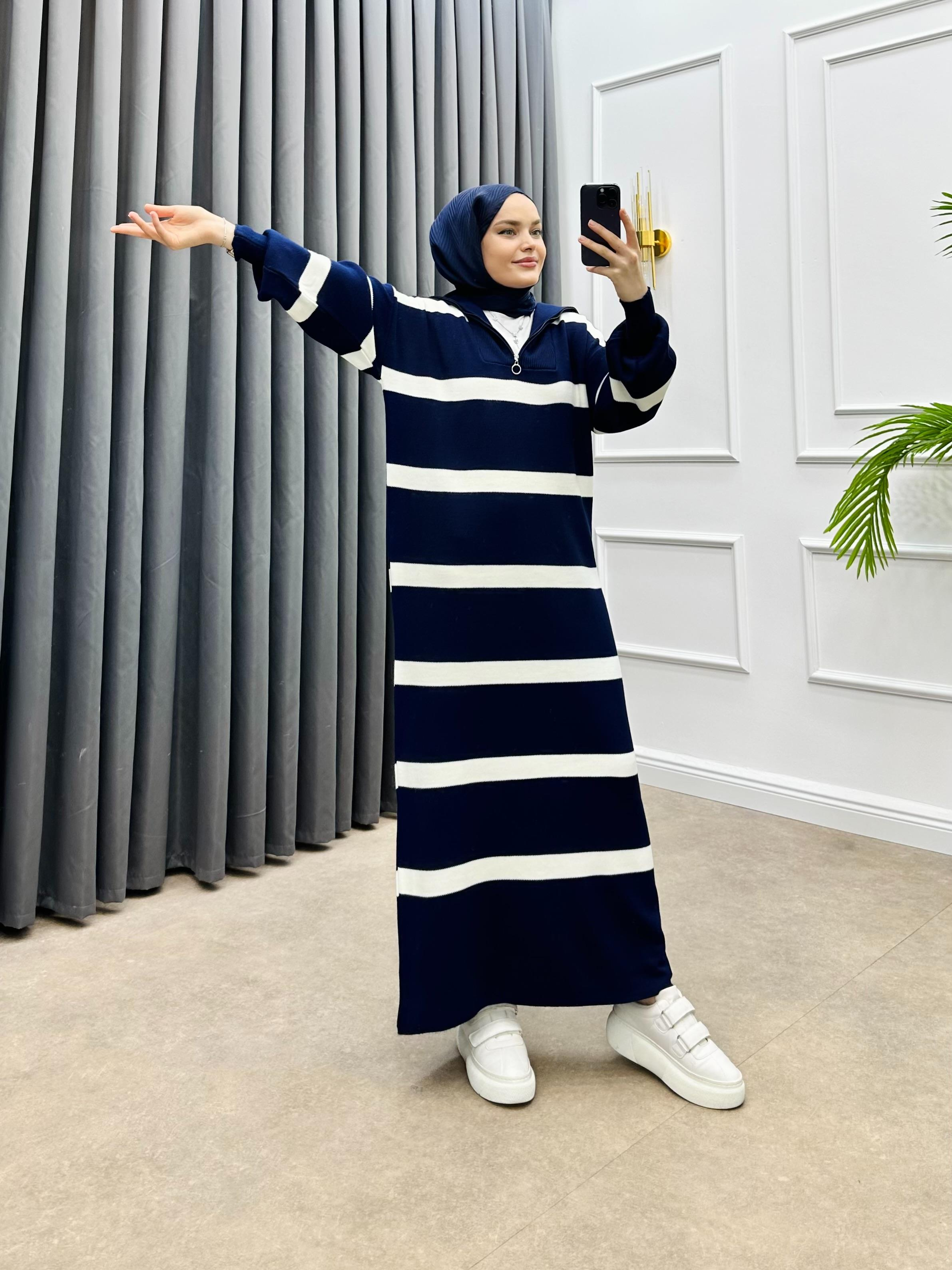 YARIM FERMUARLI ÇİZGİLİ TRİKO ELBİSE LACİVERT
