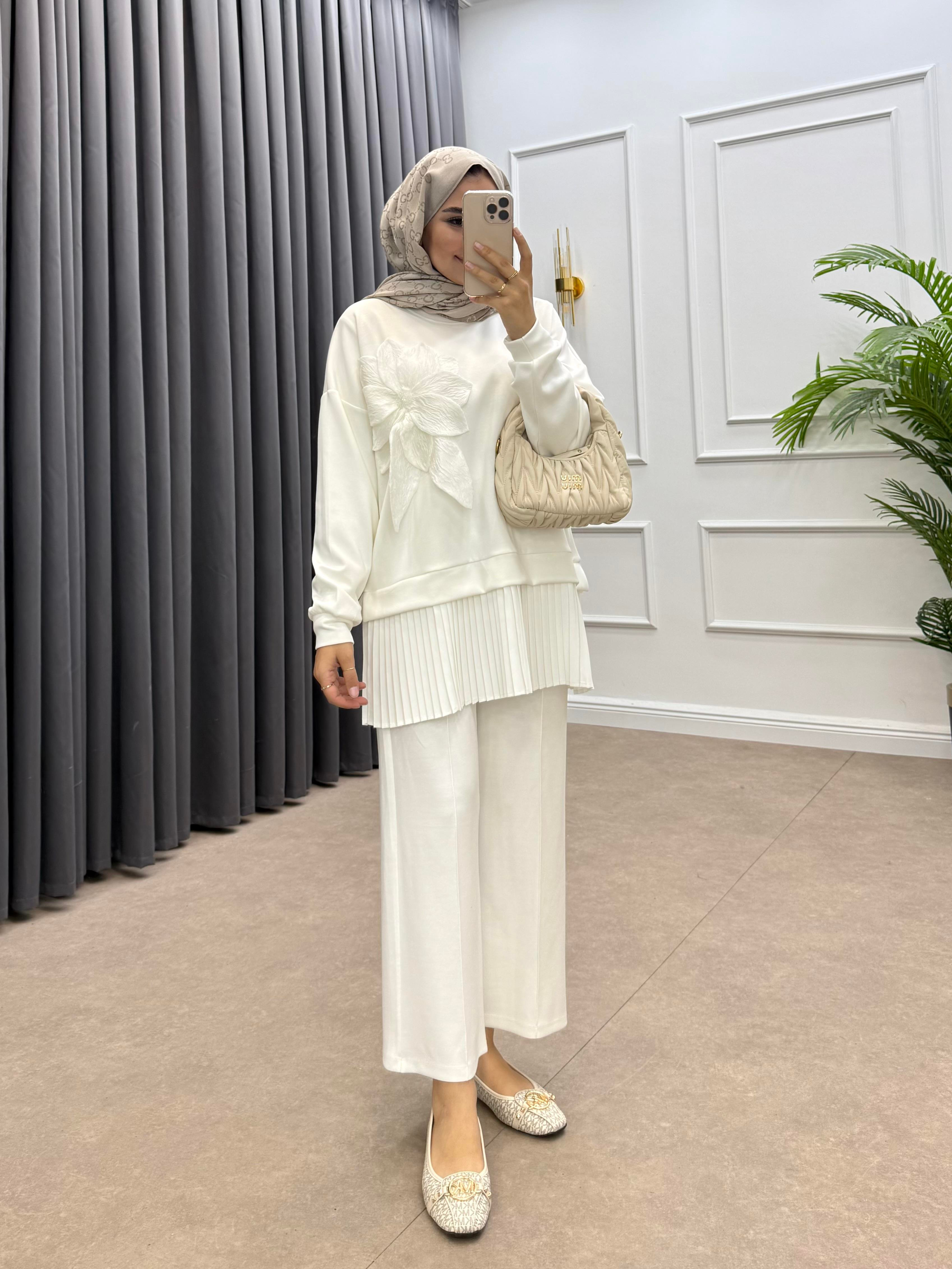 Üst boy: 80 cm Alt boy: 100 cm Beden Aralığı: 1/2 Kumaş: Pamuklulu Oys Detaylar: İkili takımdan oluşmaktadır: üst ve pantolon. Üst formunda güpür detayı mevcuttur. Etek kısmı kendinden pilselidir. Pantolon beli lastikli ve ceplidir. Pamuklulu Oys kumaşı ile rahat ve nefes alabilen bir yapı sunar. Günlük ve özel kombinlerde şıklıkla tercih edilebilir. BEDEN SEÇENEKLERİ 1 (36-38) / 2 (40-42) MANKEN BİLGİLERİ Boy: 165 cm | Kilo: 54 kg | Üzerindeki beden: 1